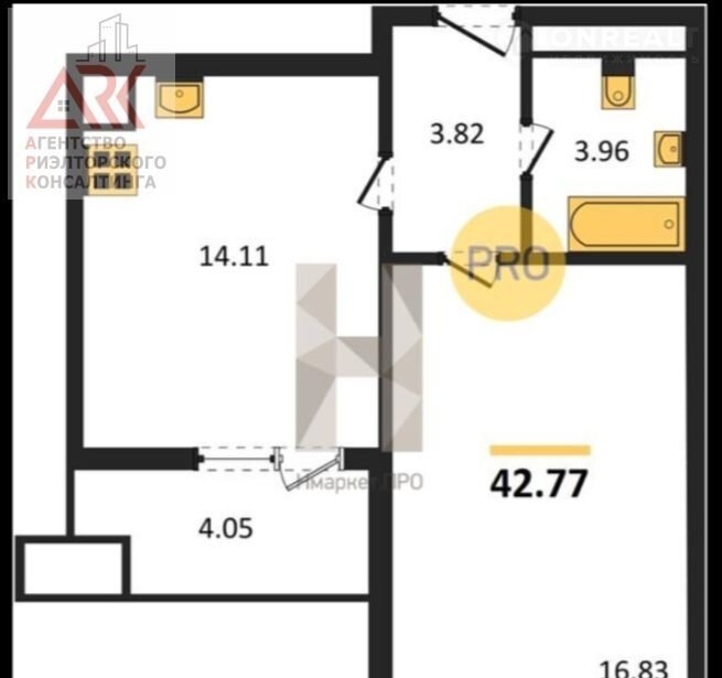 Общая площадь 42.8 м2