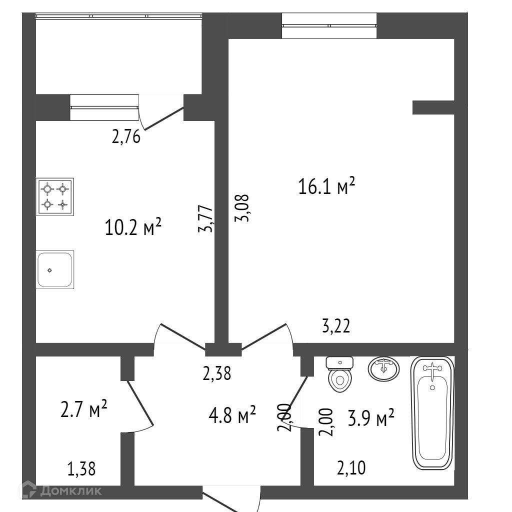 Квартира общей площадью 37,7 кв. м. с просторной кухней 10,2 кв.м. и комнатой 16,1 кв.м. расположенная на четвёртом этаже, десятиэтажного монолитно-каркасного дома. Квартира с автономным отоплением, черновая отделка. В шаговой доступности супермаркет, магазины, остановка общественного транспорта. На территории детская площадка, подземная парковка, магазины, спортзалы,