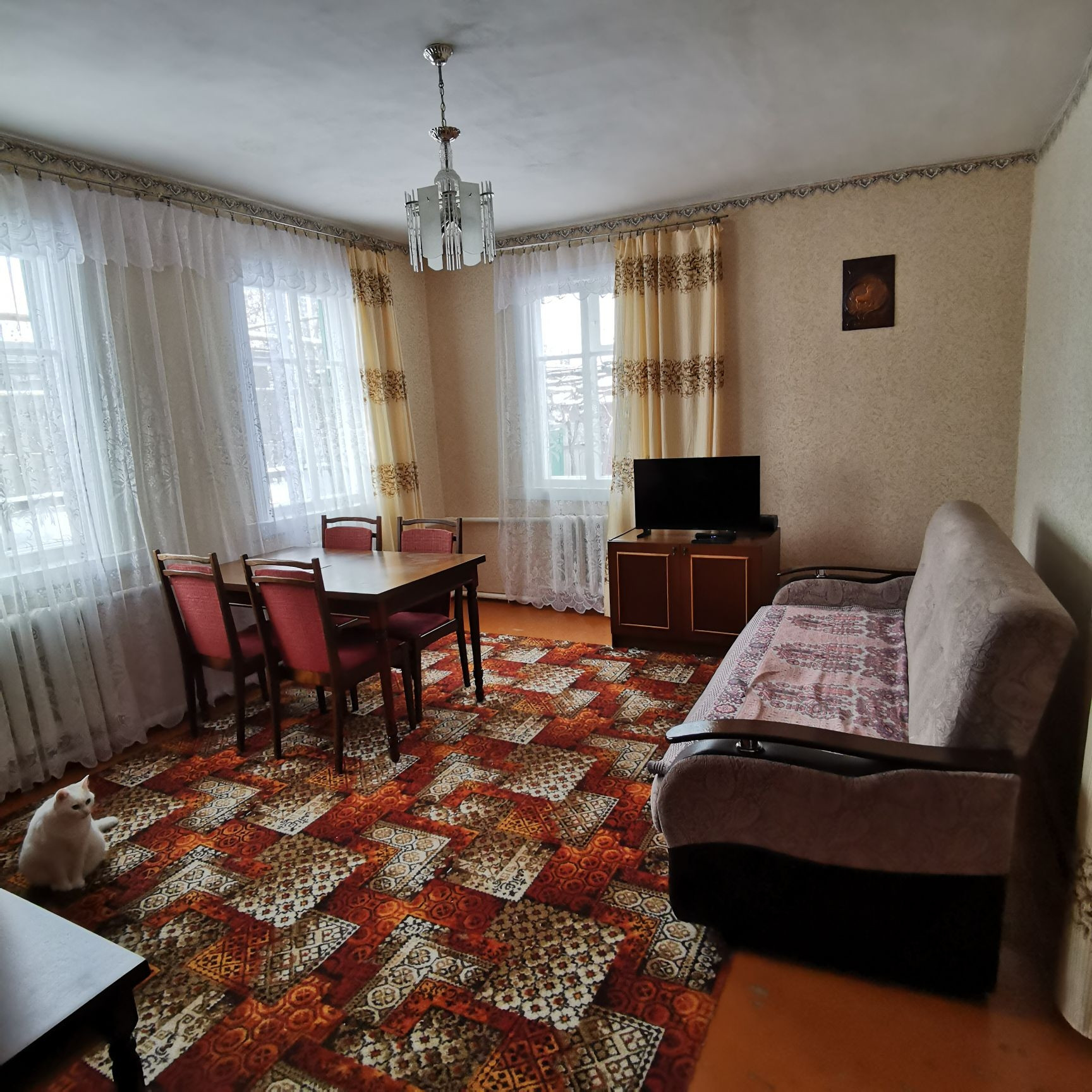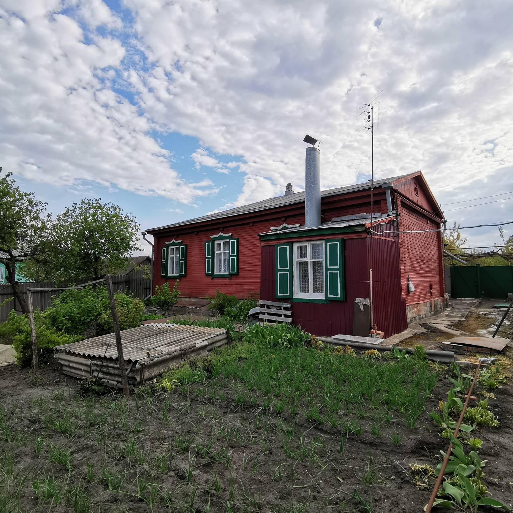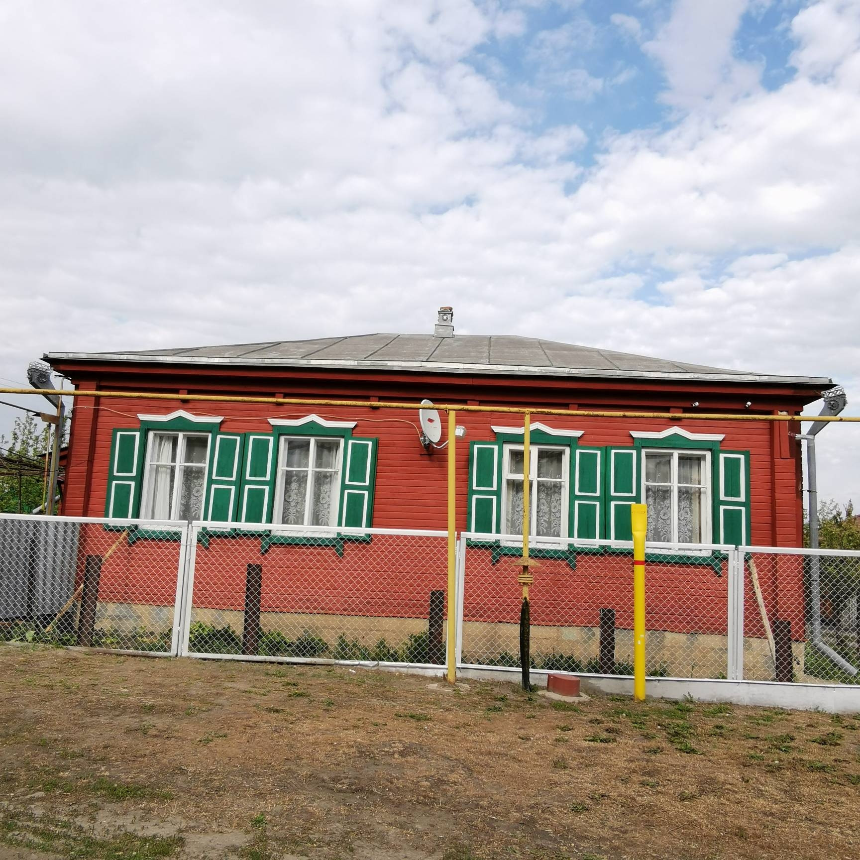 Продаётся деревянный дом построенный из дуба, площадью 107.6 метров квадратных. В доме имеются все коммуникации: газовое отопление, вода, ванна, туалет, две огромные канализации, интернет, телефон. Четыре жилых комнаты и большая кухня. На территории имеется гараж, второй маленький дом из двух комнат, сараи, подал. Также имеется подвал для солений в доме. Ухоженный огород, виноградник и  сад. Во дворе имется скважина.