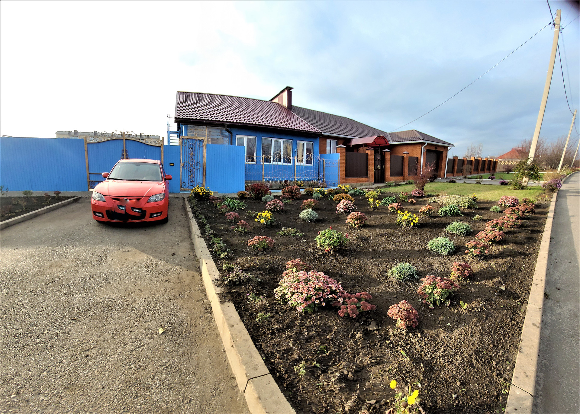 Участок облагорожен. Плодоносящий сад, кустарники. Перед домом огромные цветочные клумбы.