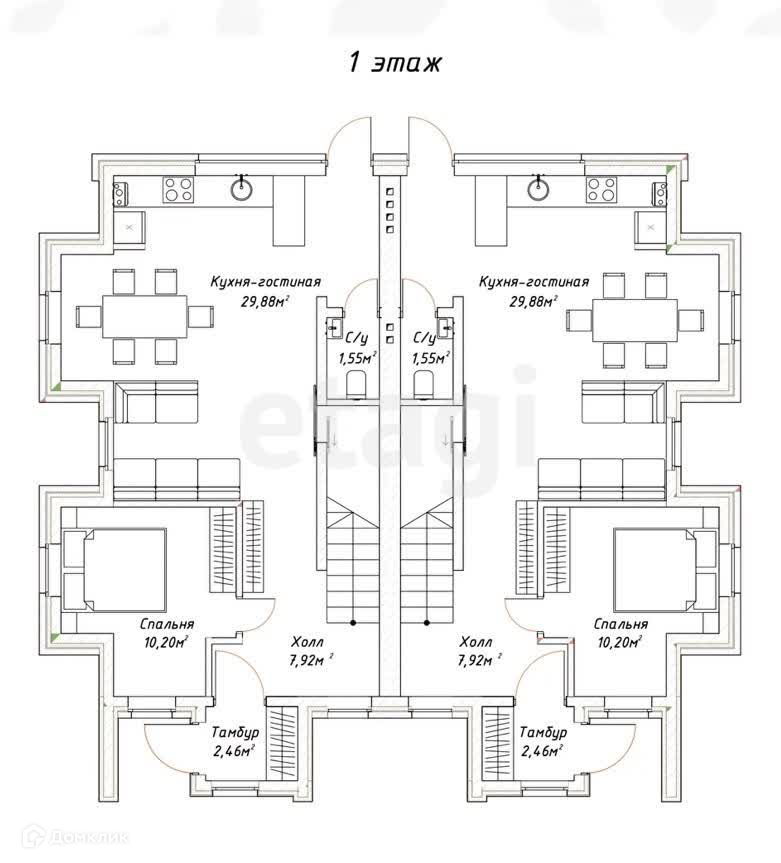 -Первый этаж: тамбурная зона, холл, кухня-гостиная с выходом на участок, жилая комната, сан. узел, техническое помещение под лестничным проёмом, где расположены коммуникации на систему теплых полов для первого этажа и счётчик на холодную воду.