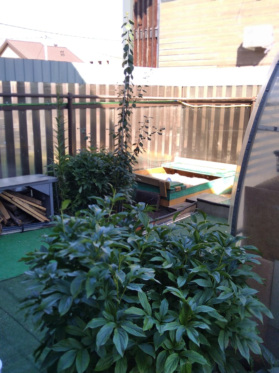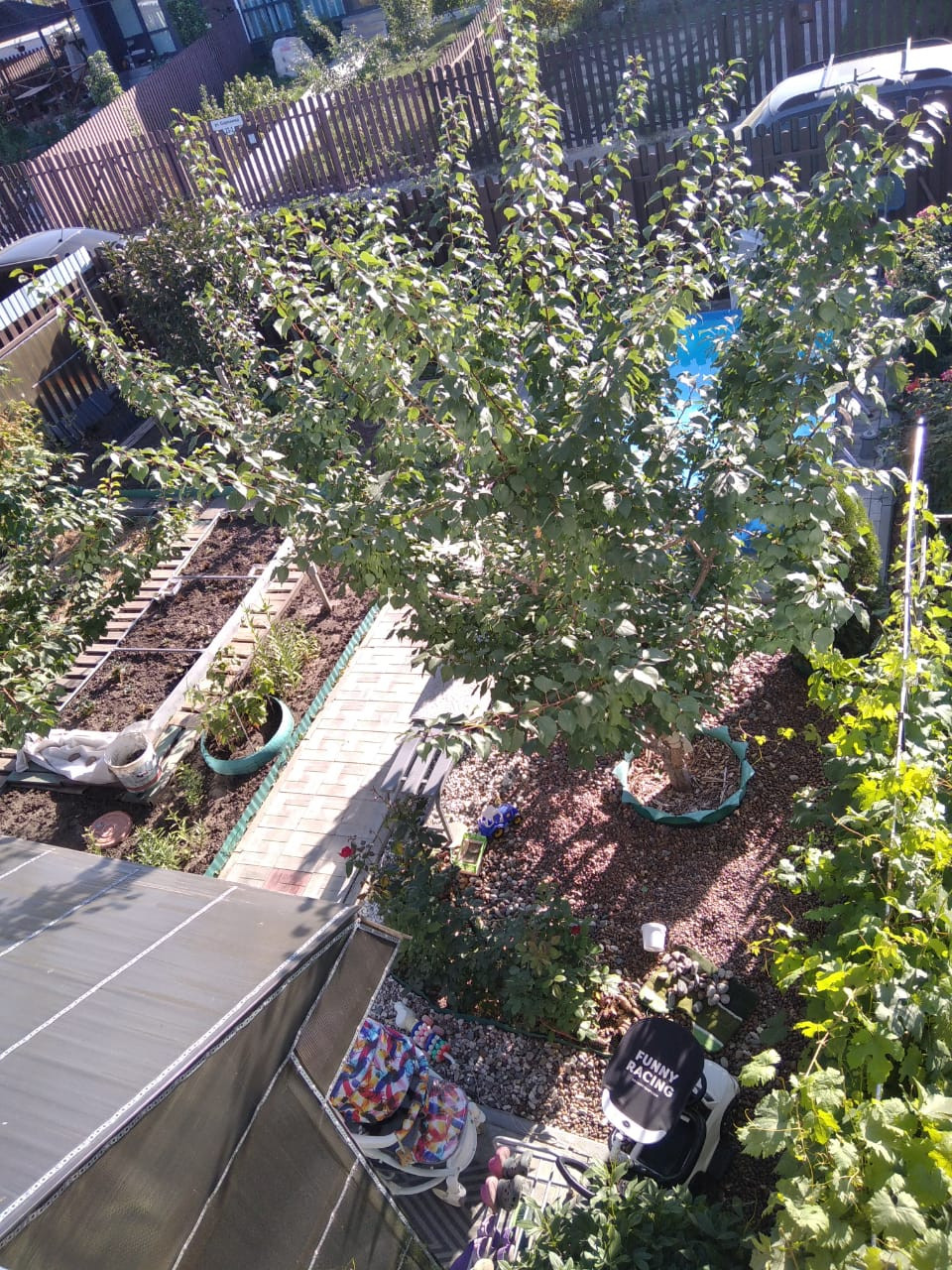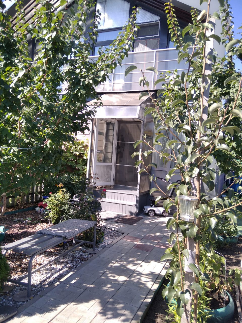 По всему участку тропинки, расположена теплица 3на6, саженцы и плодоносящие деревья: абрикос, груша, слива; кустарники: смородина, ежевика, малина, виноград, голубика, жимолось; туи, можжевельник, сортовые розы, сортовая клубника Мальвина и Соната. Все плодоносит. Есть песочница, площадка для бассейна и парковочное место для машины.