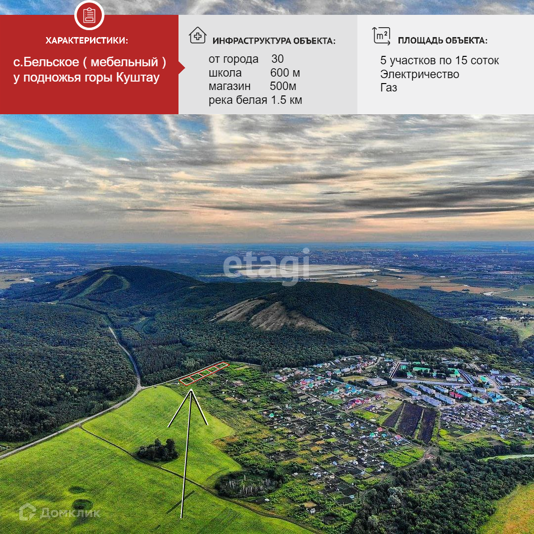 Продаётся земельный участок в с. Бельское, расположенный в живописном месте у подножия горы КУШ-ТАУ, 1.5 км река Белая. Площадь участка 15 соток, участок правильной формы и размежеван.
