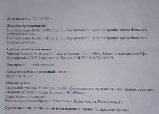 Участок под индивидуальное жилищное строение 7 соток в г. Феодосия с. Береговое, ул. Раздольная,21Продажа от собственника!!!В наличии все документы. |