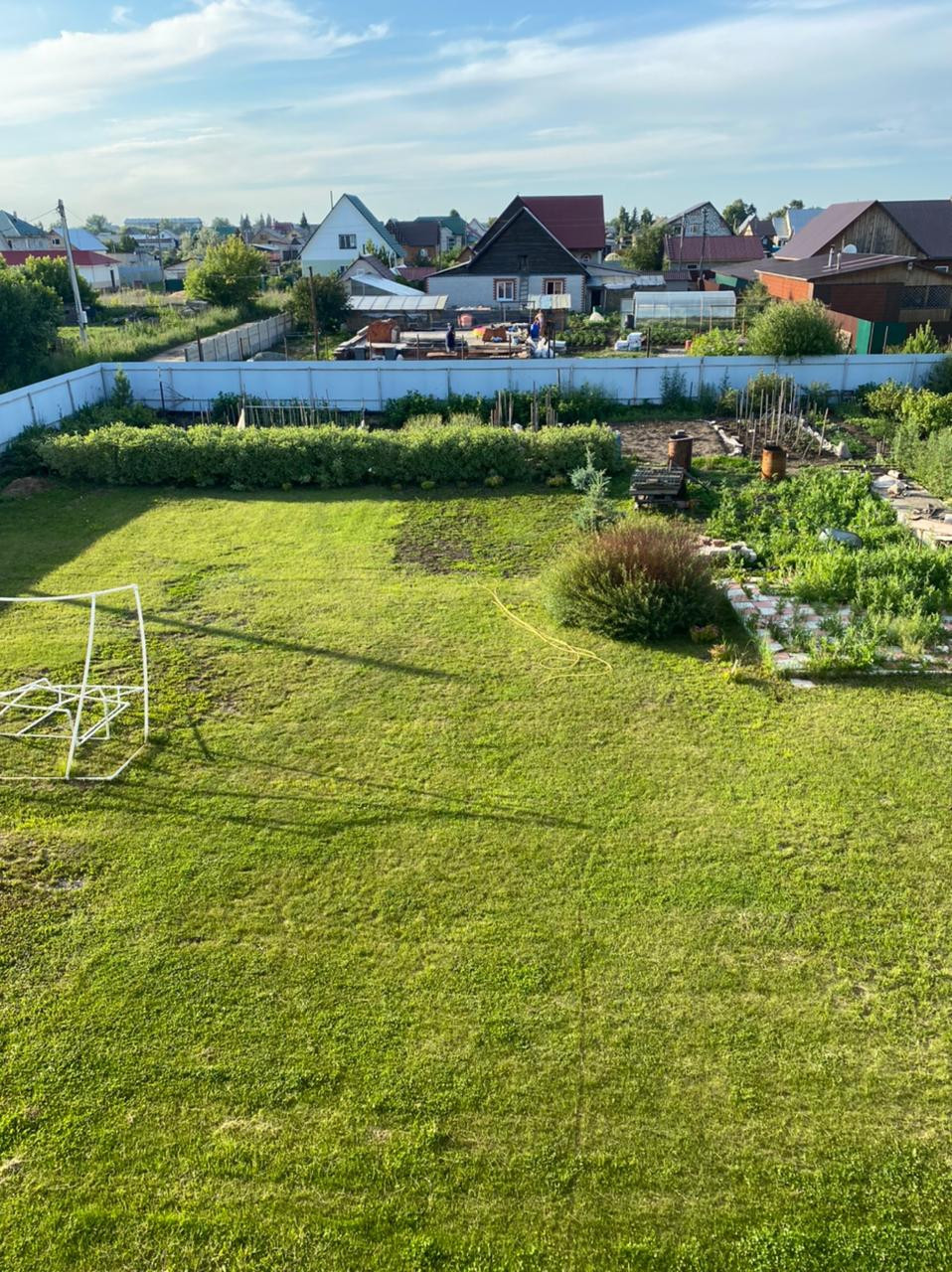 Земельный участок разделён на 2 части: огород и газонная площадка, где летом можно играть в футбол.