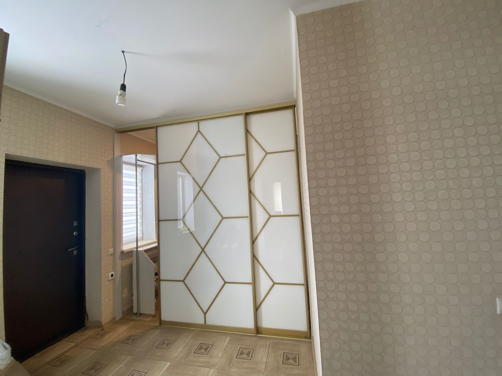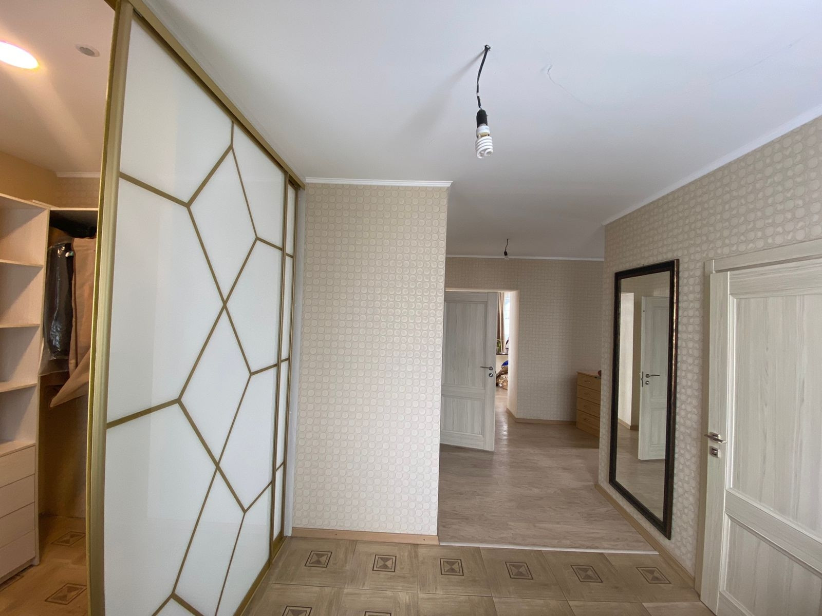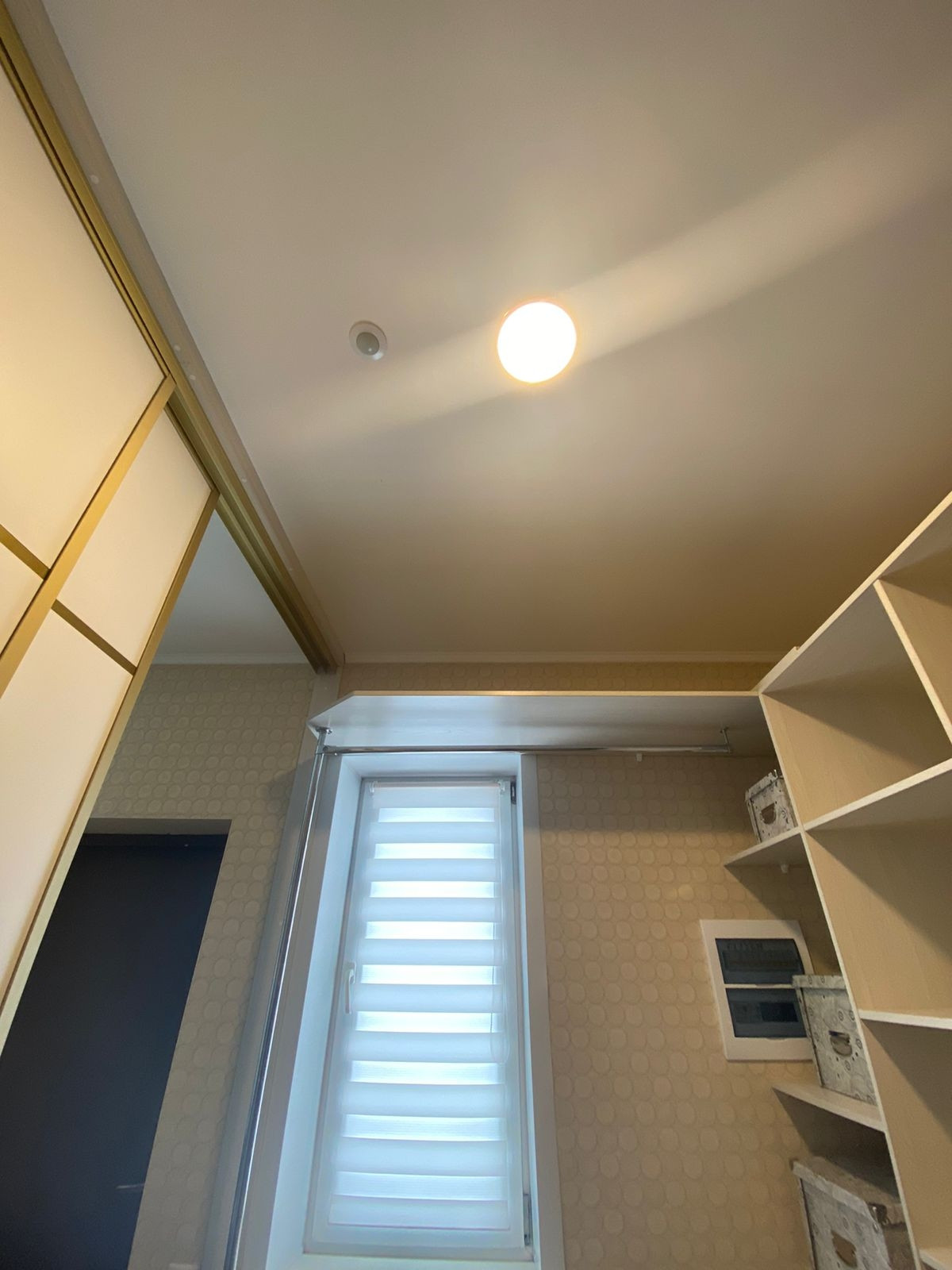 Двери в гардеробную состоят из двух раздвигающихся частей, выполненных из стекла лакобель.