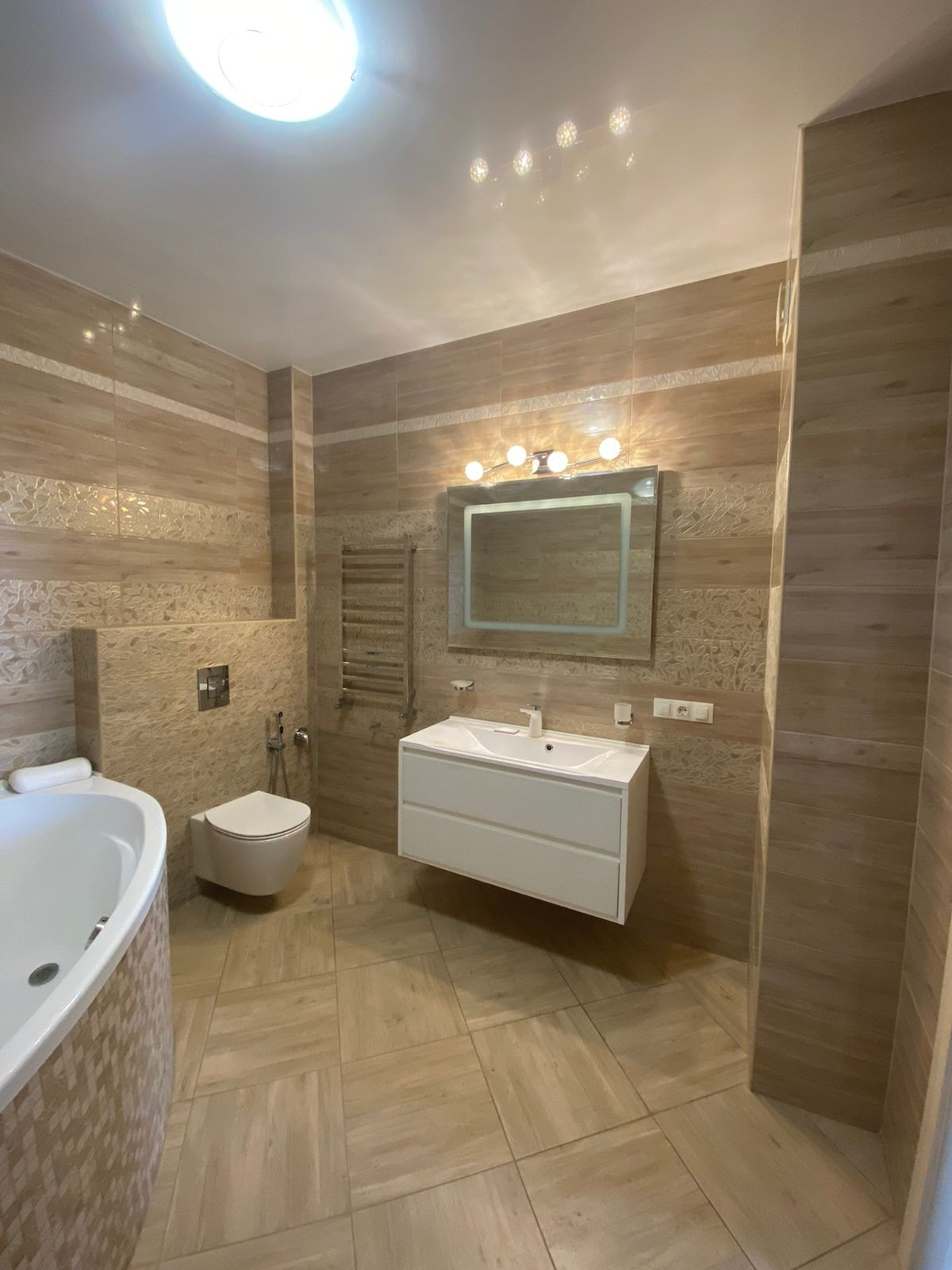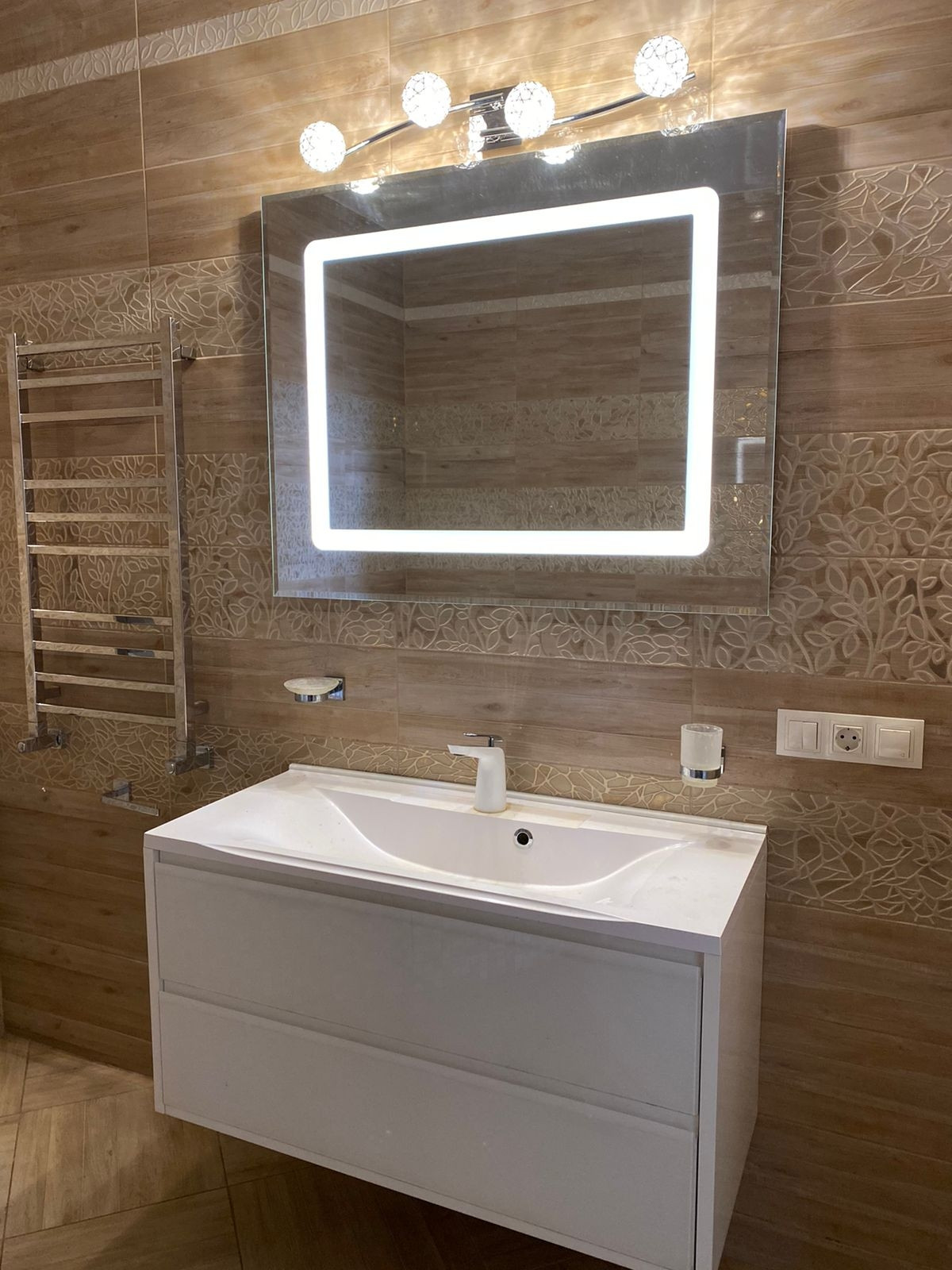 Включает в себя акриловую ванну фирмы TRITON, метровую раковину со встроенной тумбой - Aquaton, зеркало с подсветкой и подогревом.