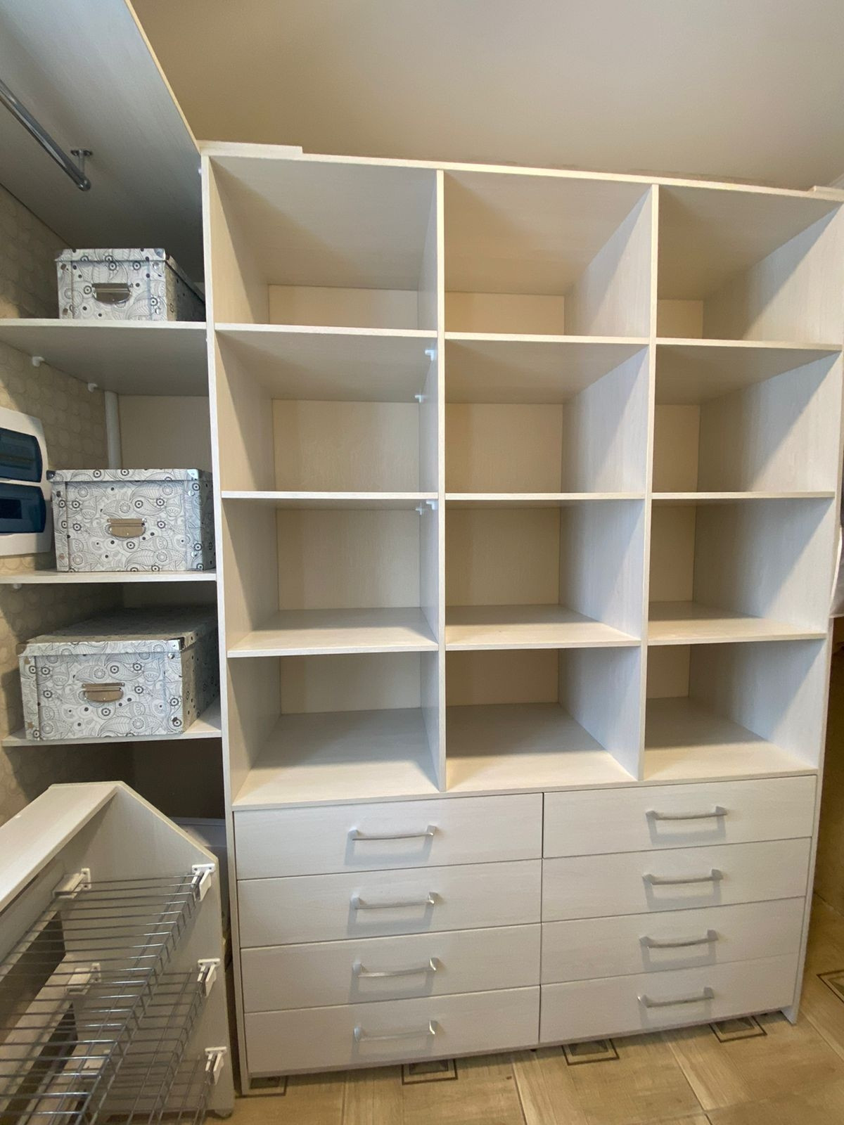 Установлены два просторных комода, полки для хранения вещей и обуви.