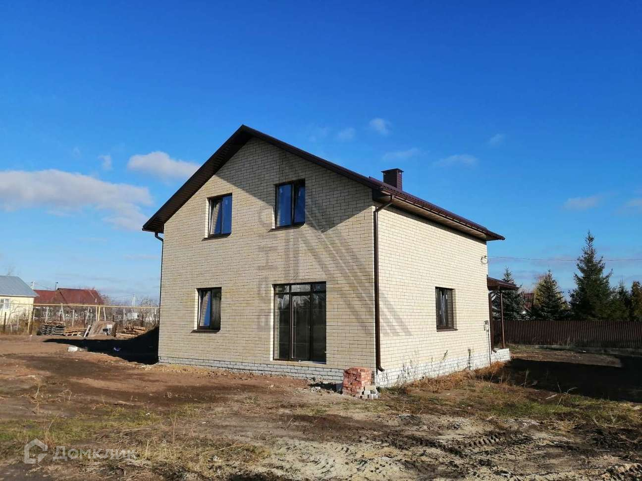 Материал постройки - газосиликатный блок, облицован декоративным кирпичом. Кровля металлочерепица.