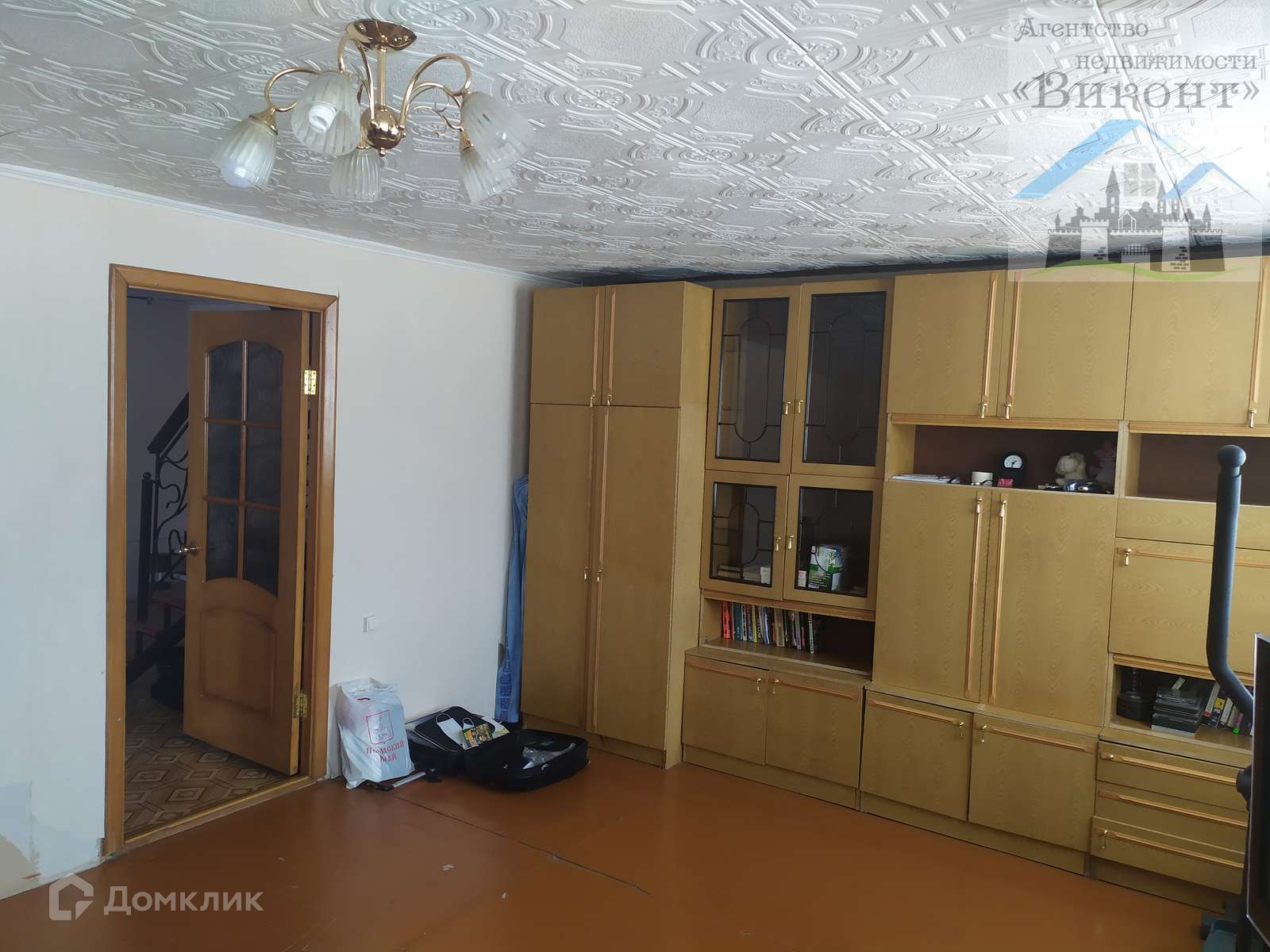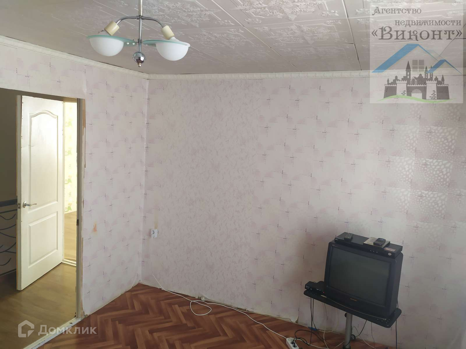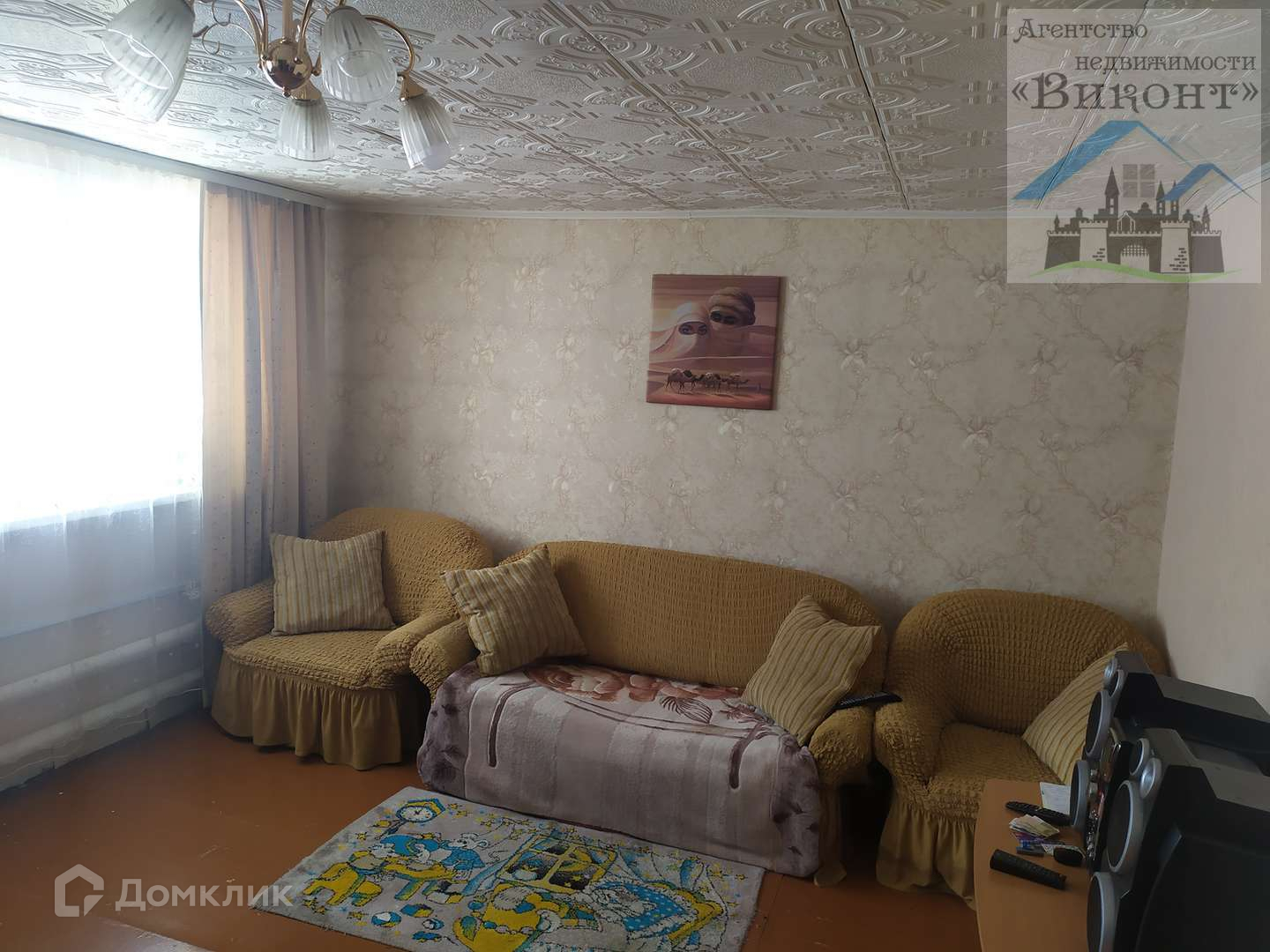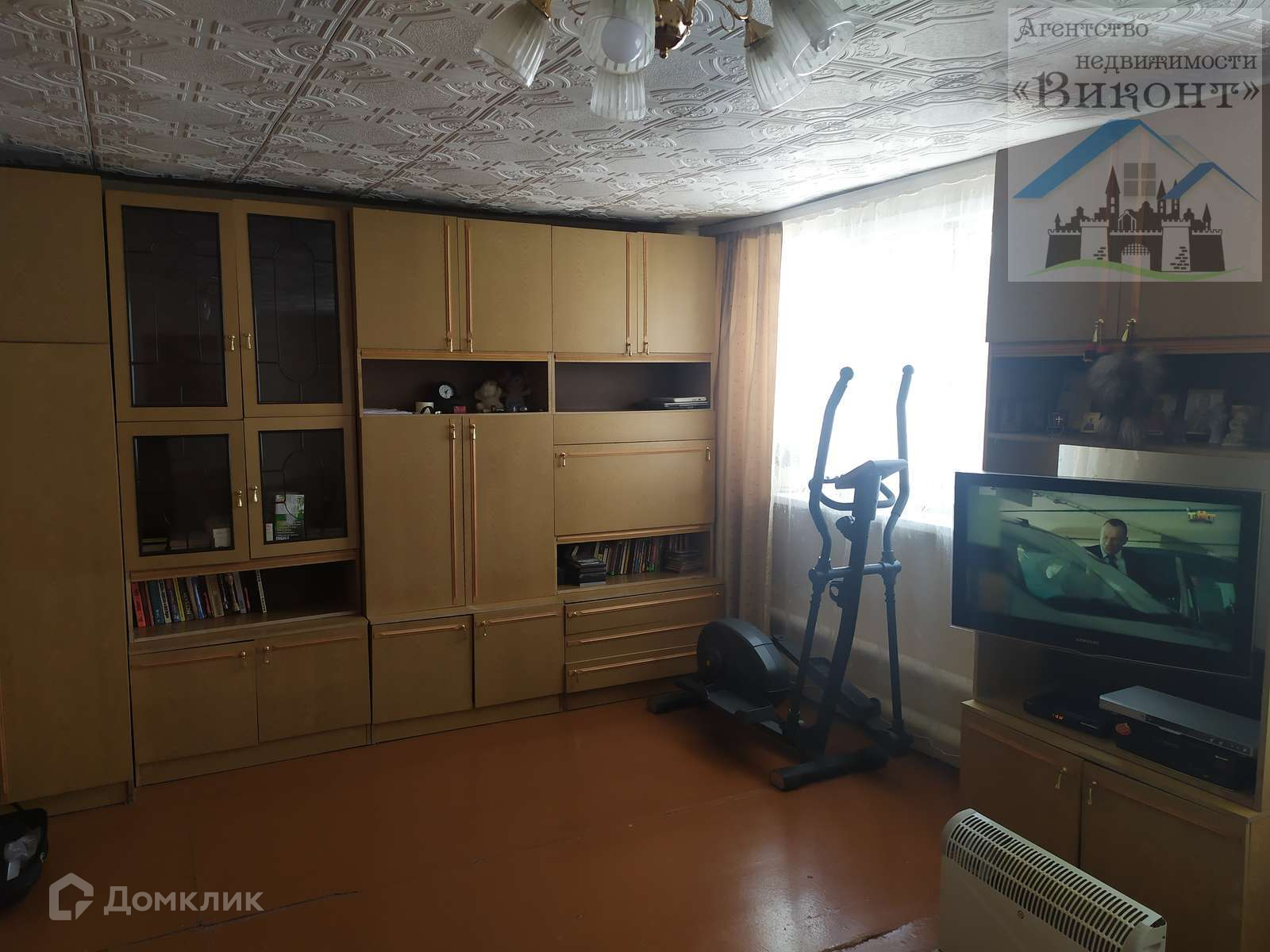 Гостиная светлая, имеет 2 окна. Высота потолка в гостиной 2,3 м. На полу линолеум.