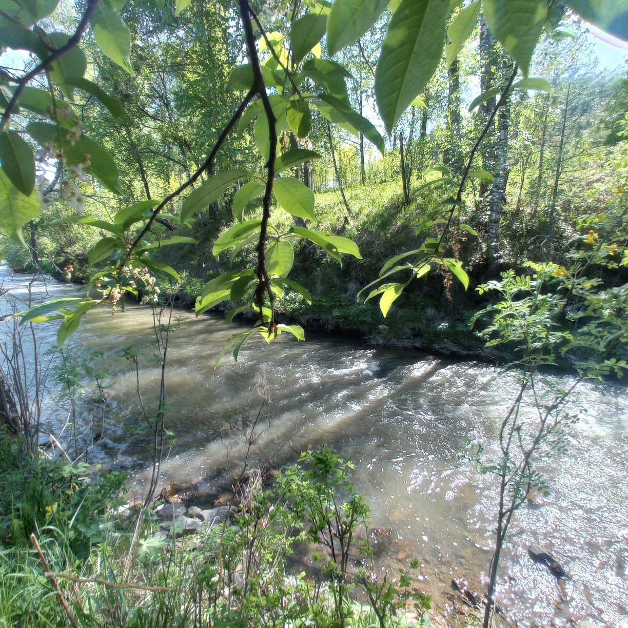 Участок в двух уровнях, вытянутый вдоль реки. Берег достаточно высокий, к воде подойти легко, много деревьев и кустарников. Большую часть дня участок открыт для солнца, ветра почти нет.