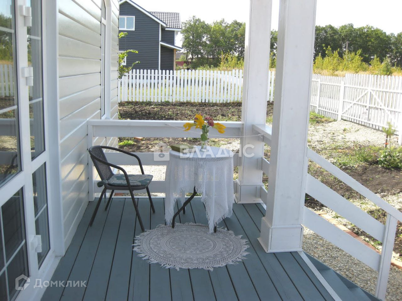 Участок 9 соток, огорожен с 4-х сторон евроштакетником белого цвета, выложены дорожки вокруг дома из гравия и кирпича, земля возделана, разбит огород, высажен молодой сад (абрикос, груша, слива, алыча, яблоня, смородина, черемуха, малина).