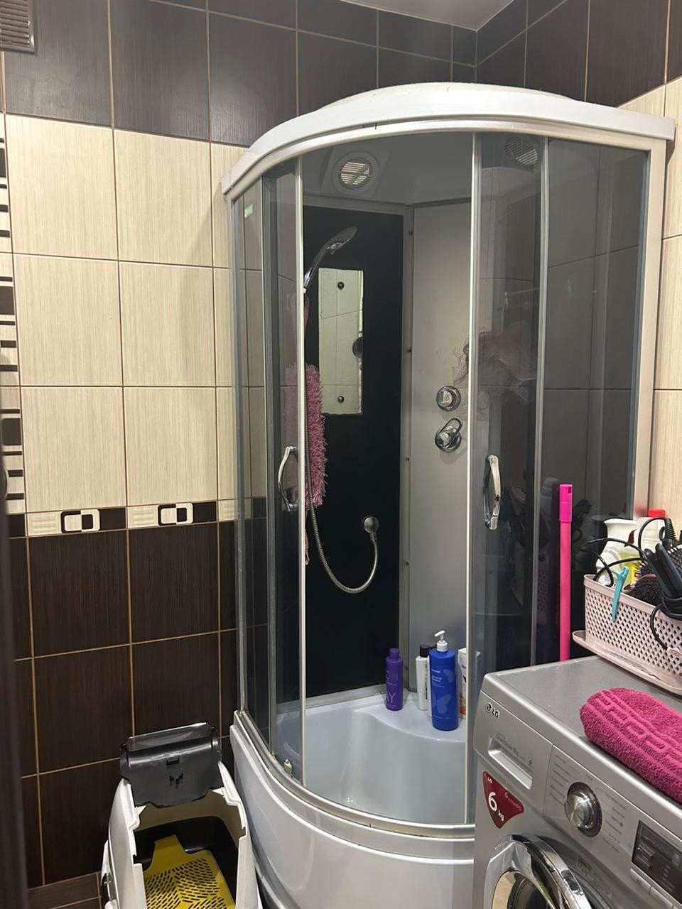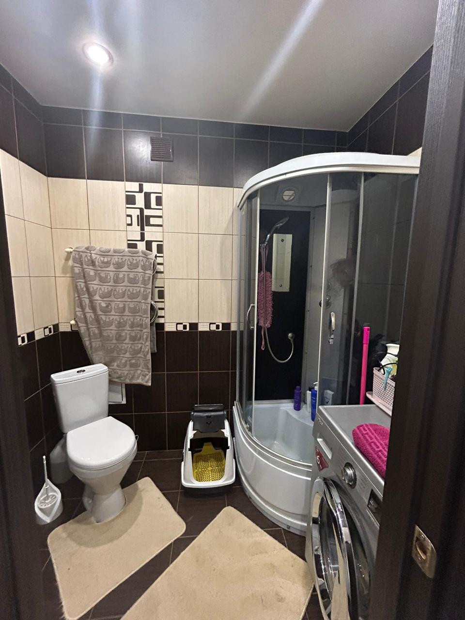 - ванная комната в плитке, установлена душевая кабина