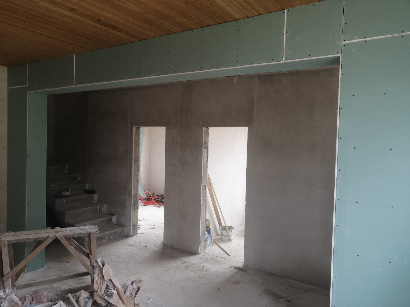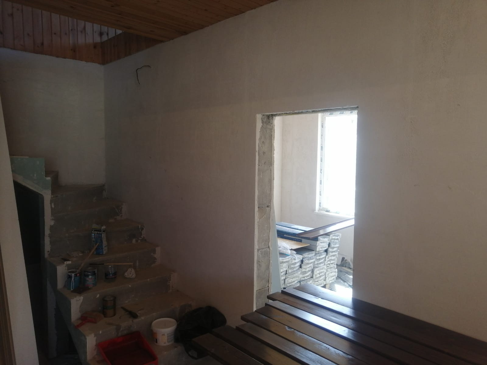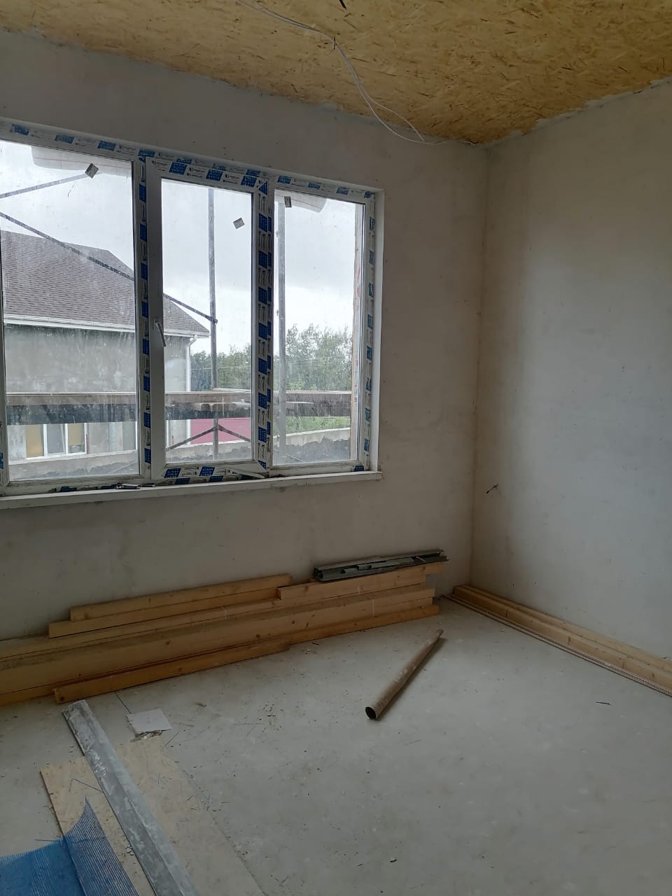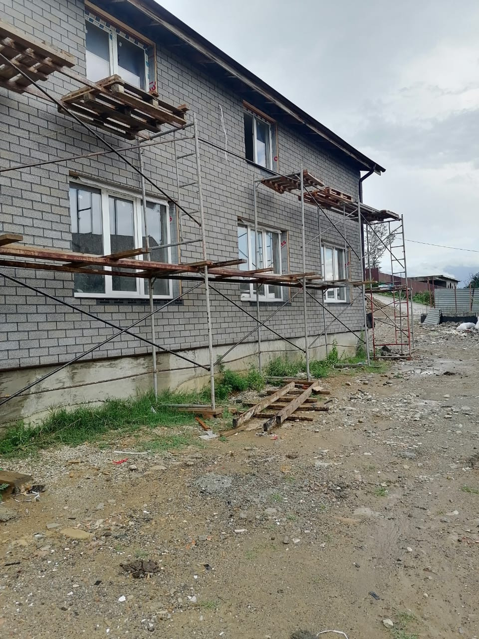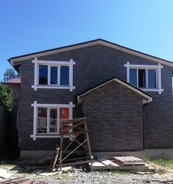 Материал стен - керамзитоблок первый этаж и каркас второй этаж, предчистовая отделка, разводка электрики, воды, канализации, ЛОС глубокой очистки, подпорные стены со всех сторон,