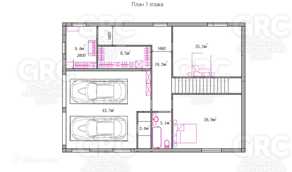 1 этаж: гараж на две машины, две спальня, гардеробная, кладовая, санузла.
