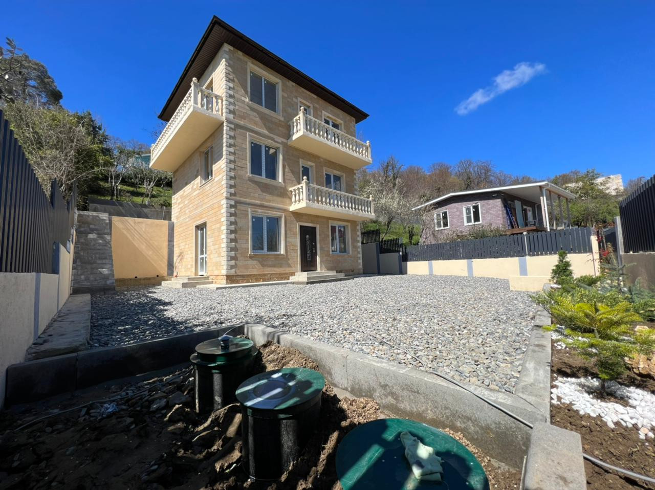 Участок 424 кв.м. Полностью выровнен. Отсыпан щебнем. Вдоль забора сделано ландшафтное озеленение.