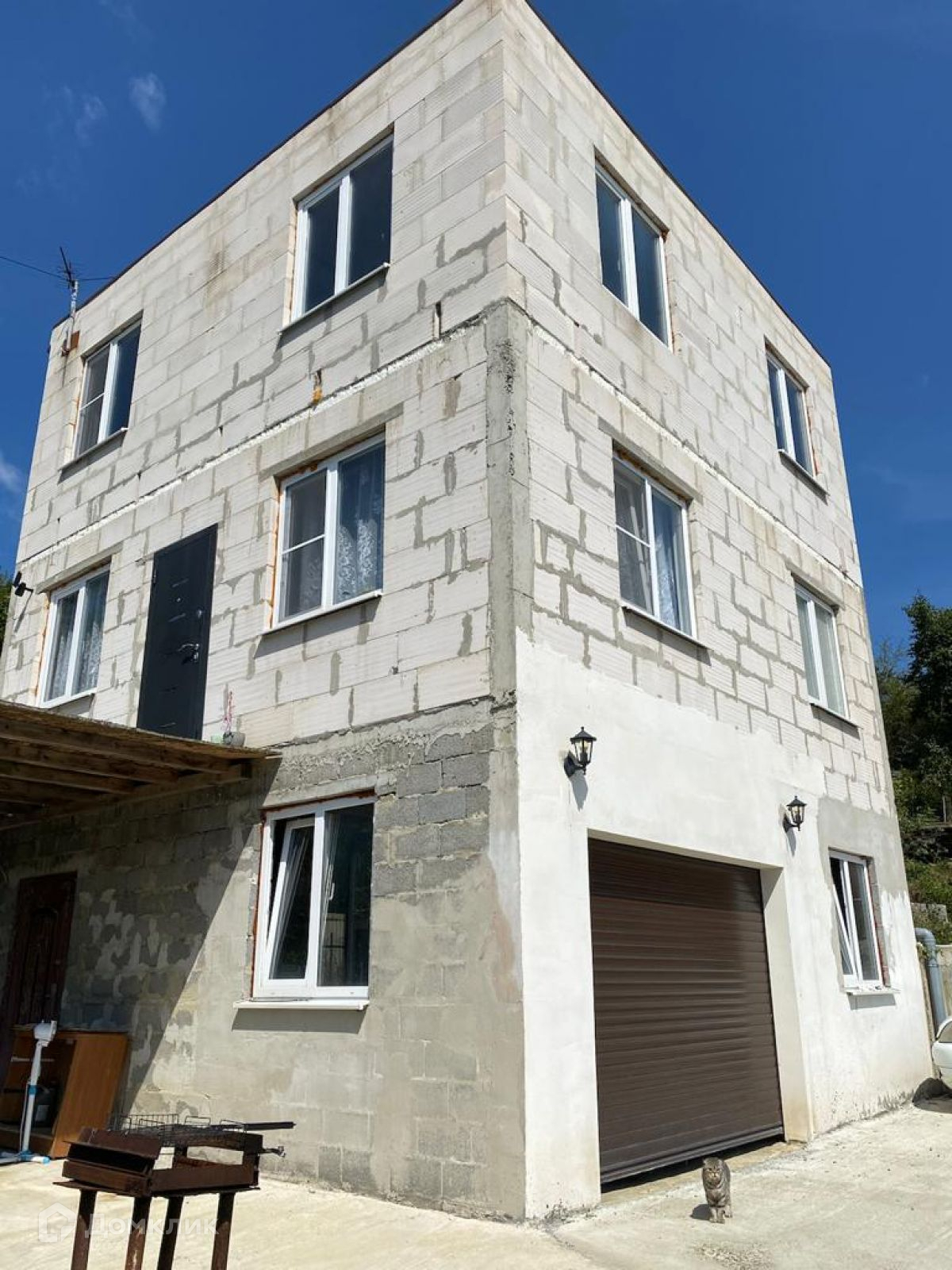 Капитальное строение, 3 этажа, частичная отделка. Есть гараж. Свет и вода заведены в дом, септик, газ проходит по границе участка рядом с воротами.