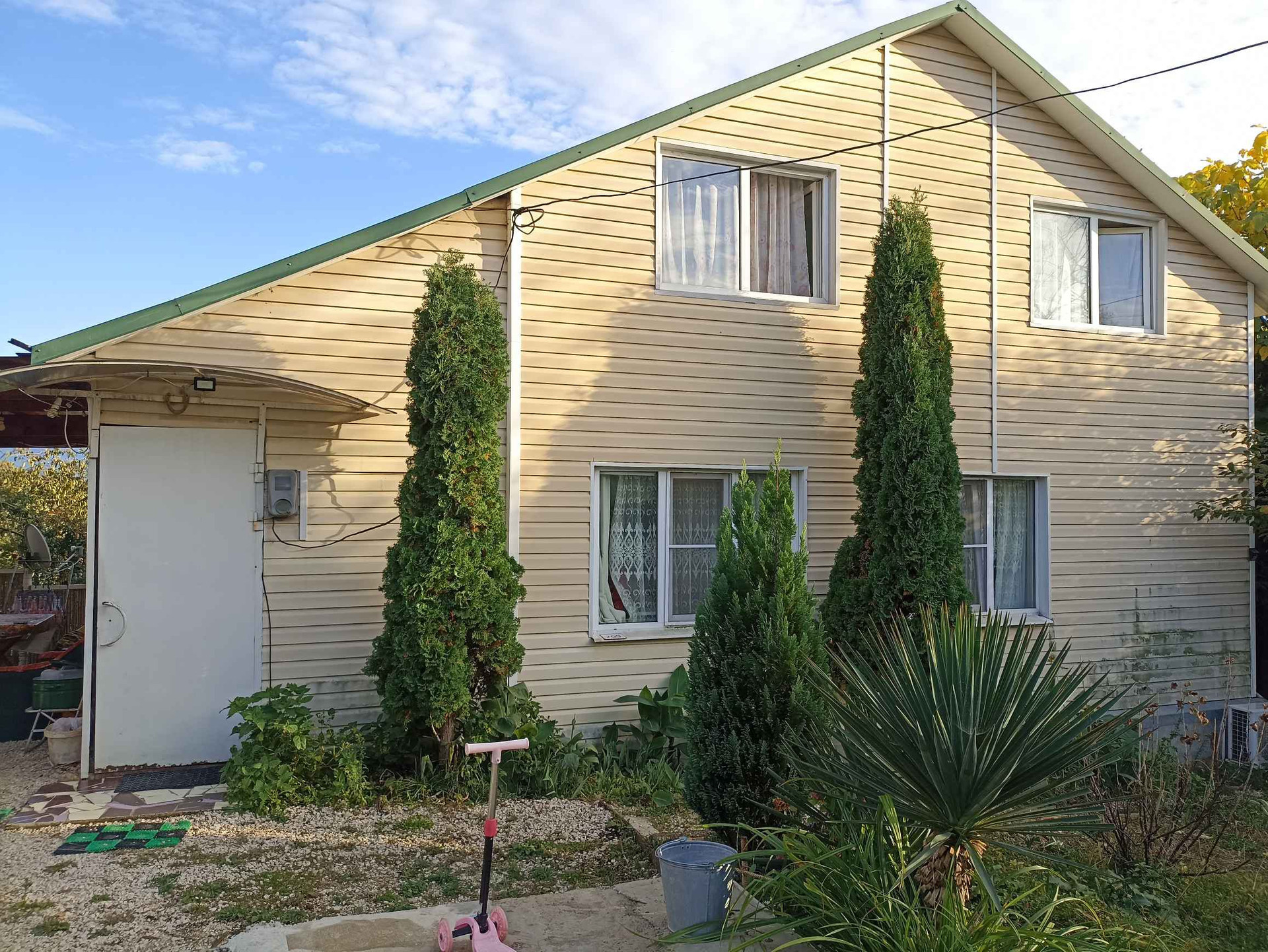 Продается каркасно-щитовой дом. 120м2. 1 этаж: коридор, санузел совмещенный, гостиная и кухня-столовая. 2 этаж: три спальни. Дом обшит сайдингом, утеплен. Есть навес для отдыха. Во дворе большой гараж-ангар с откатными воротами. Въезд во двор тоже с откатными воротами. Поместится 2 машины. Во дворе ландшафтный дизайн. Участок ровный. Имеются плодово-ягодные деревья и кустарники. Дорога до дома асфальтирована. В поселке имеются: Магнит, продуктовые и строительные магазины, салон красоты, библиотека, магазин "Всё для виноделия", стадион, частный детский сад, OZON. В перспективе постройка школы. Ходит школьный и рейсовый автобусы. Соседи все дружные. Торг уместен.