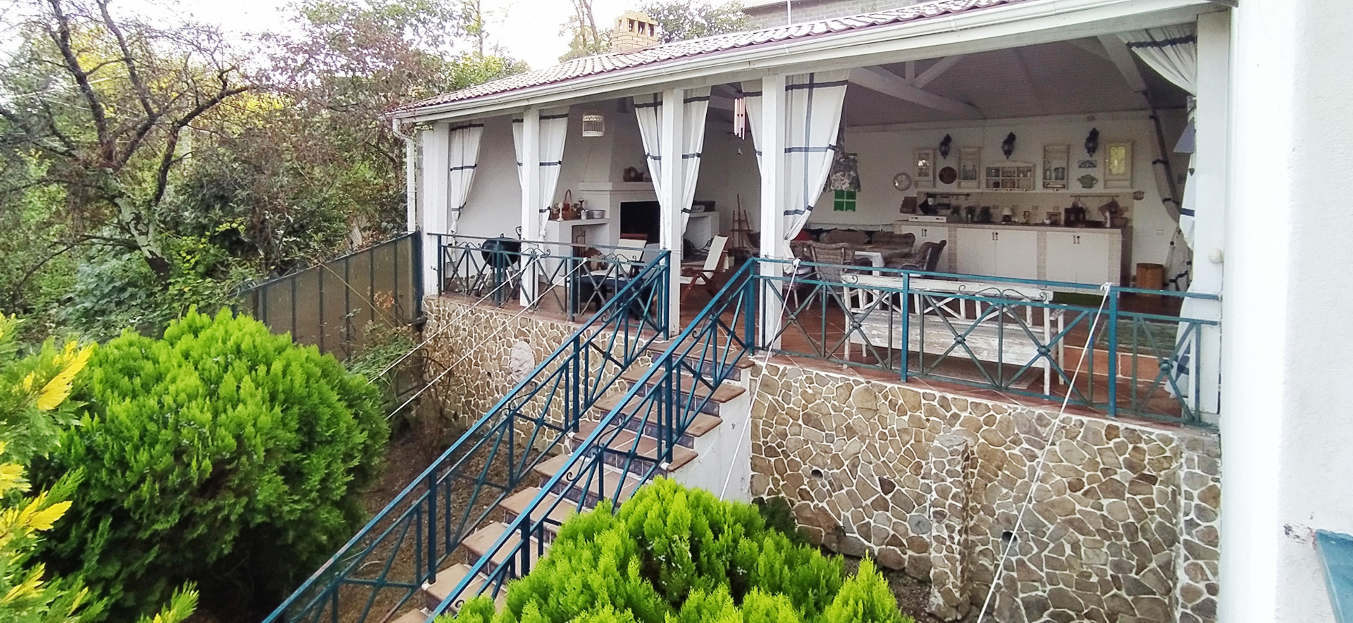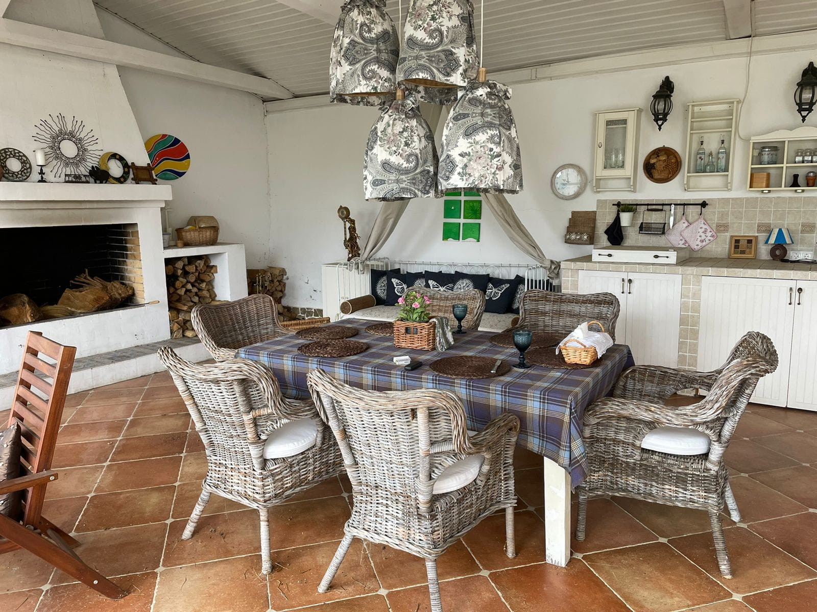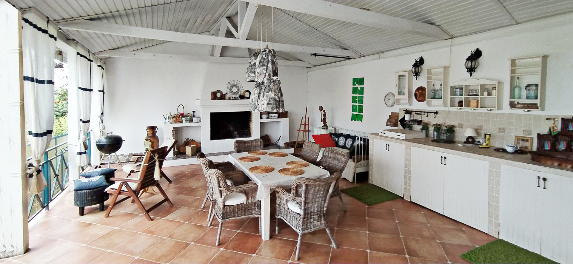 - Большая веранда с камином, летней кухней, барбекю, большим столом и плетеными креслами.