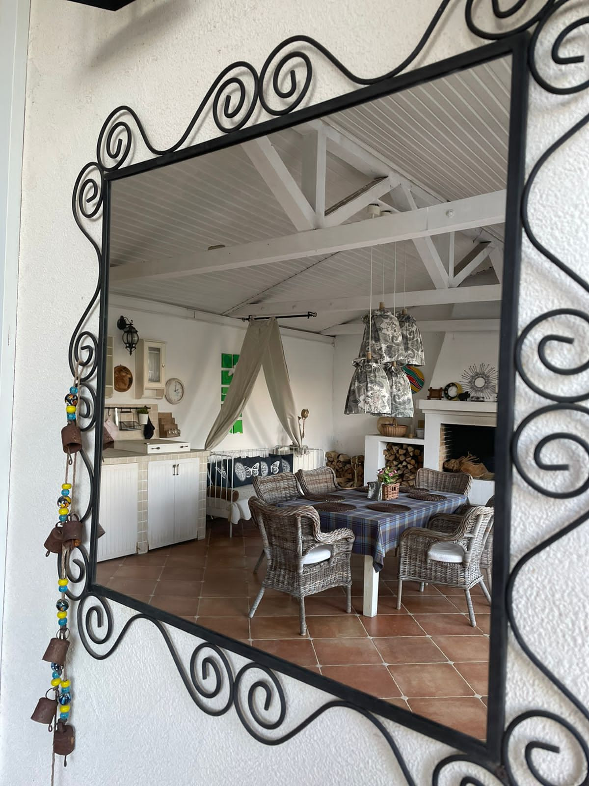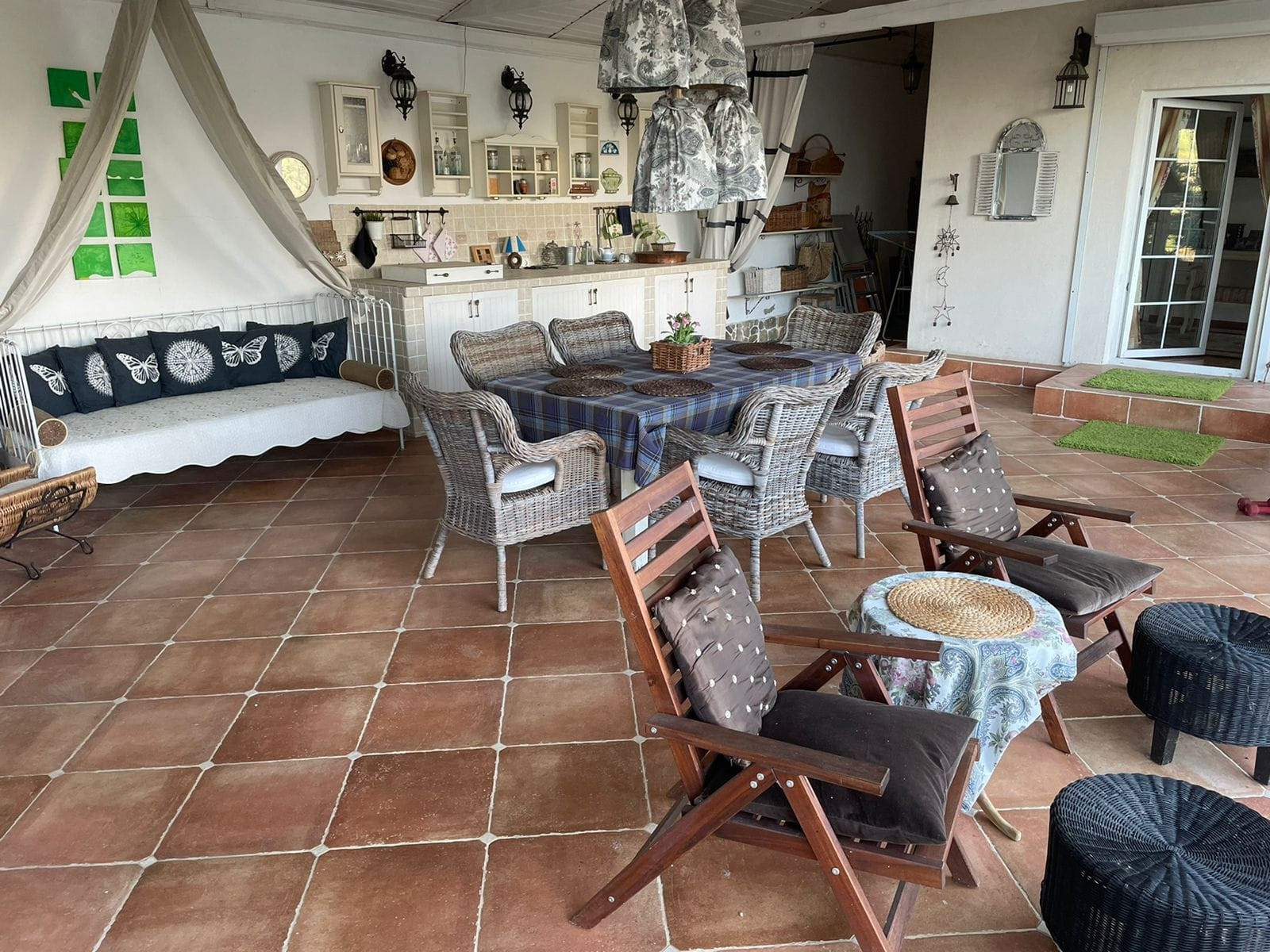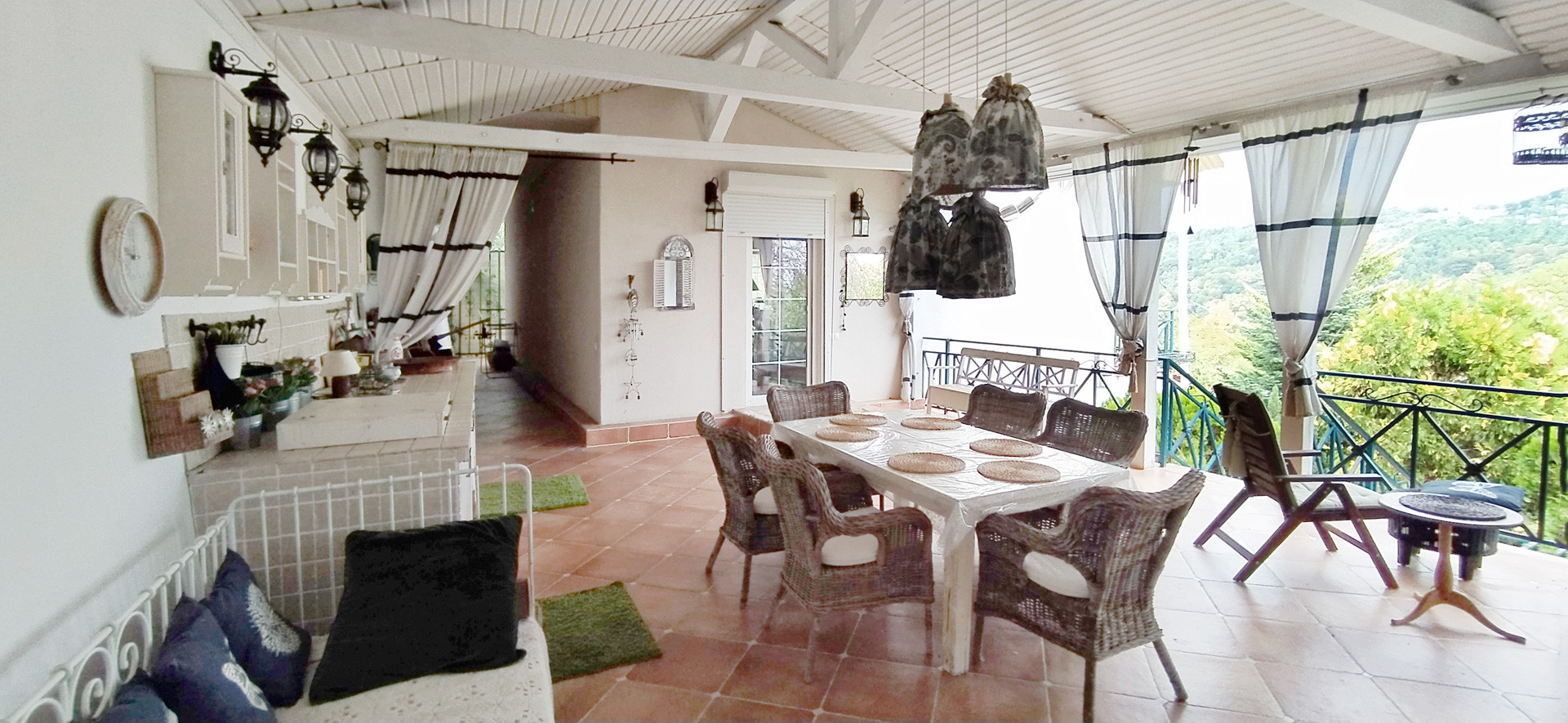 - Большая веранда с камином, летней кухней, барбекю, большим столом и плетеными креслами.