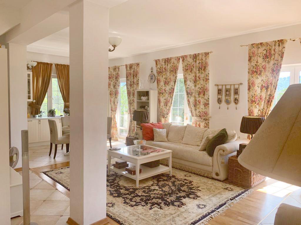 2 этаж (72м2) большая гостиная, совмещенная со столовой и кухней (с теплым полом), камин, кинотеатр, туалетная комната с теплым полом и душевой кабиной, стиральной и сушильной машинами, выход на террасу (63 м2) с большим камином и барбекю, балкон во всю ширина фасада.