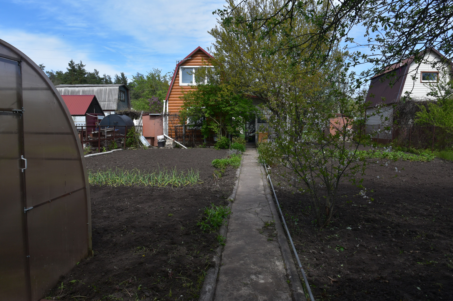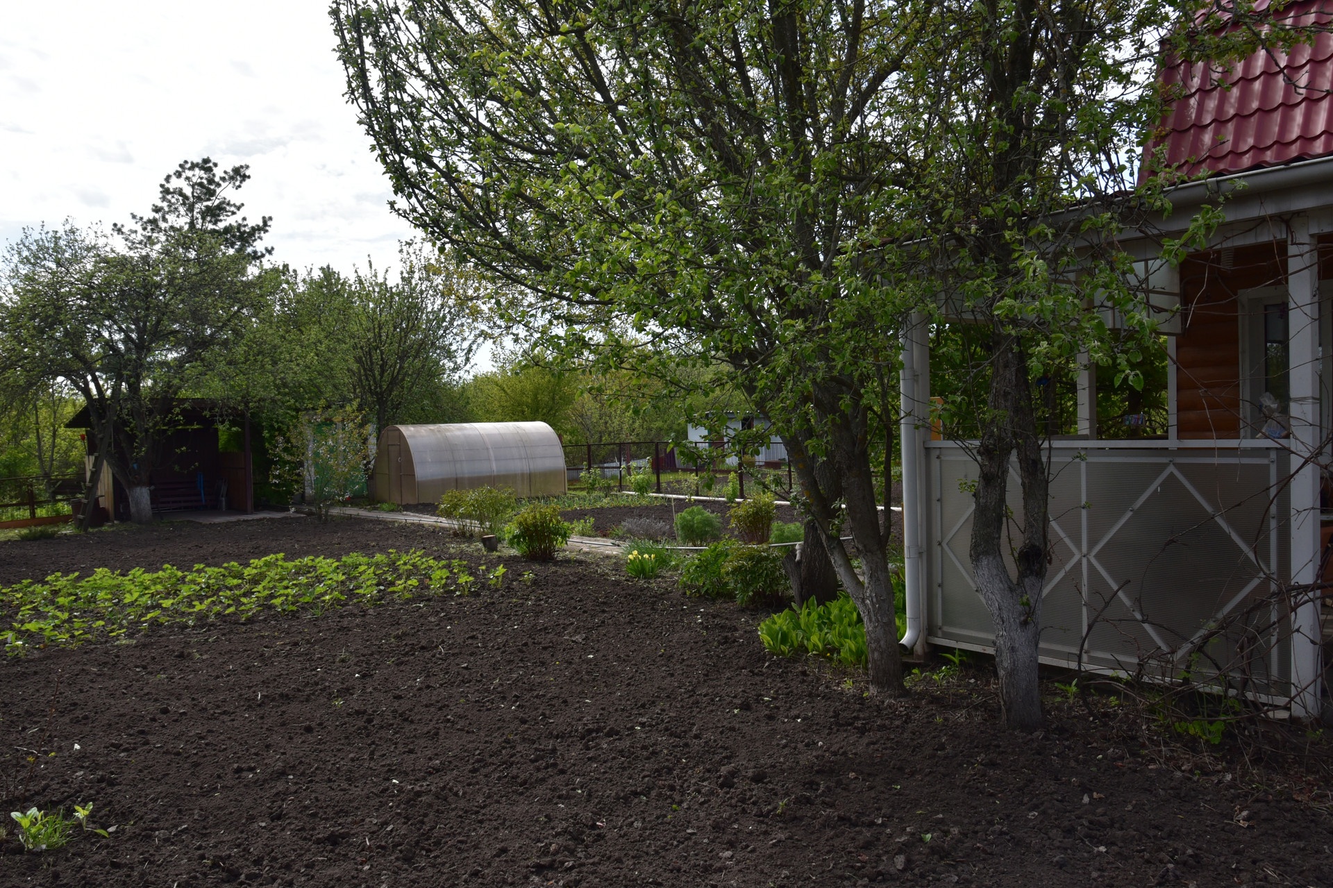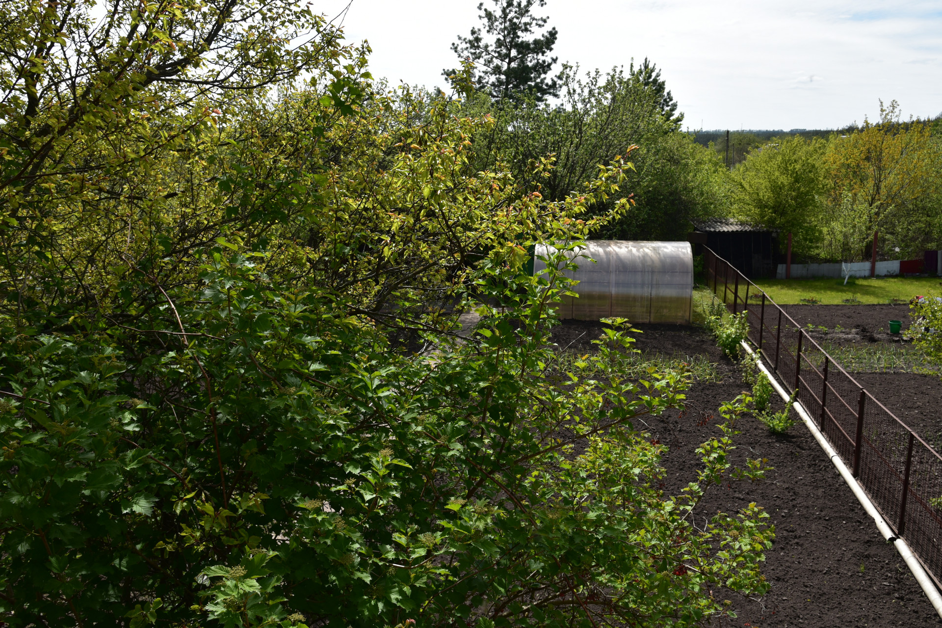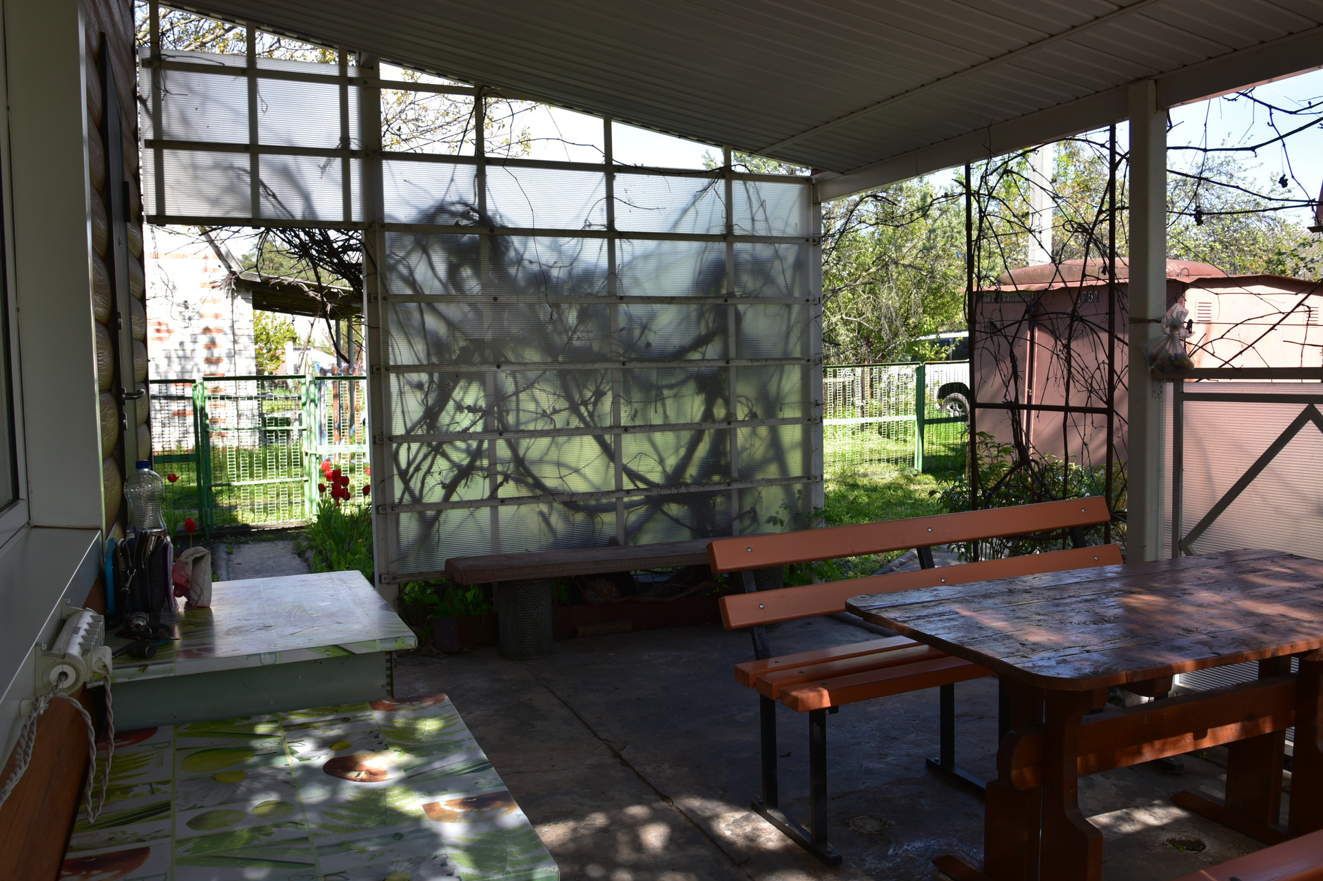 Теплица размером 3х4 м с автополивом. Емкость для воды объемом 2 куб. м. Хоз.помещение для хранения инвентаря, летний душ с подогревом воды, зона барбекю.