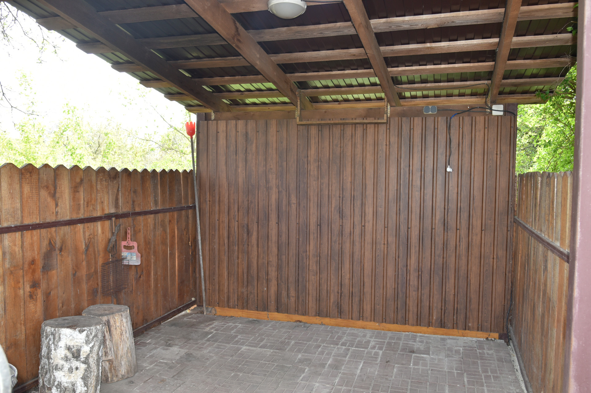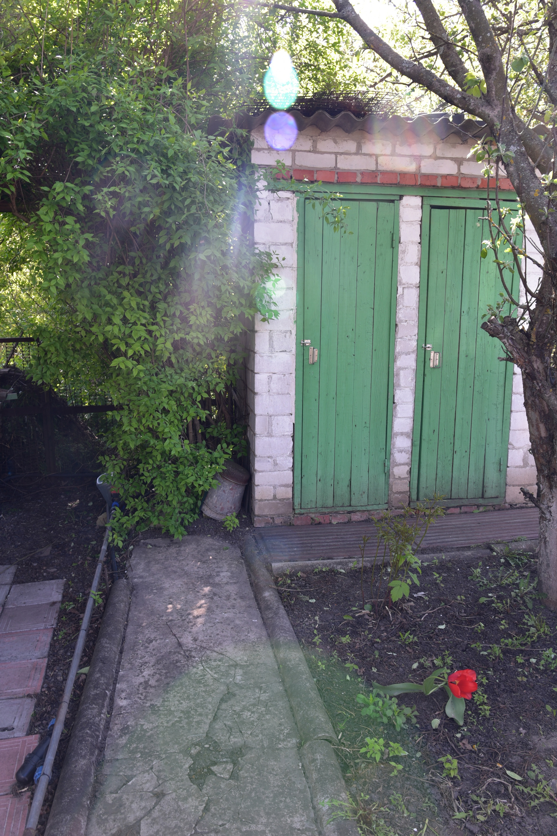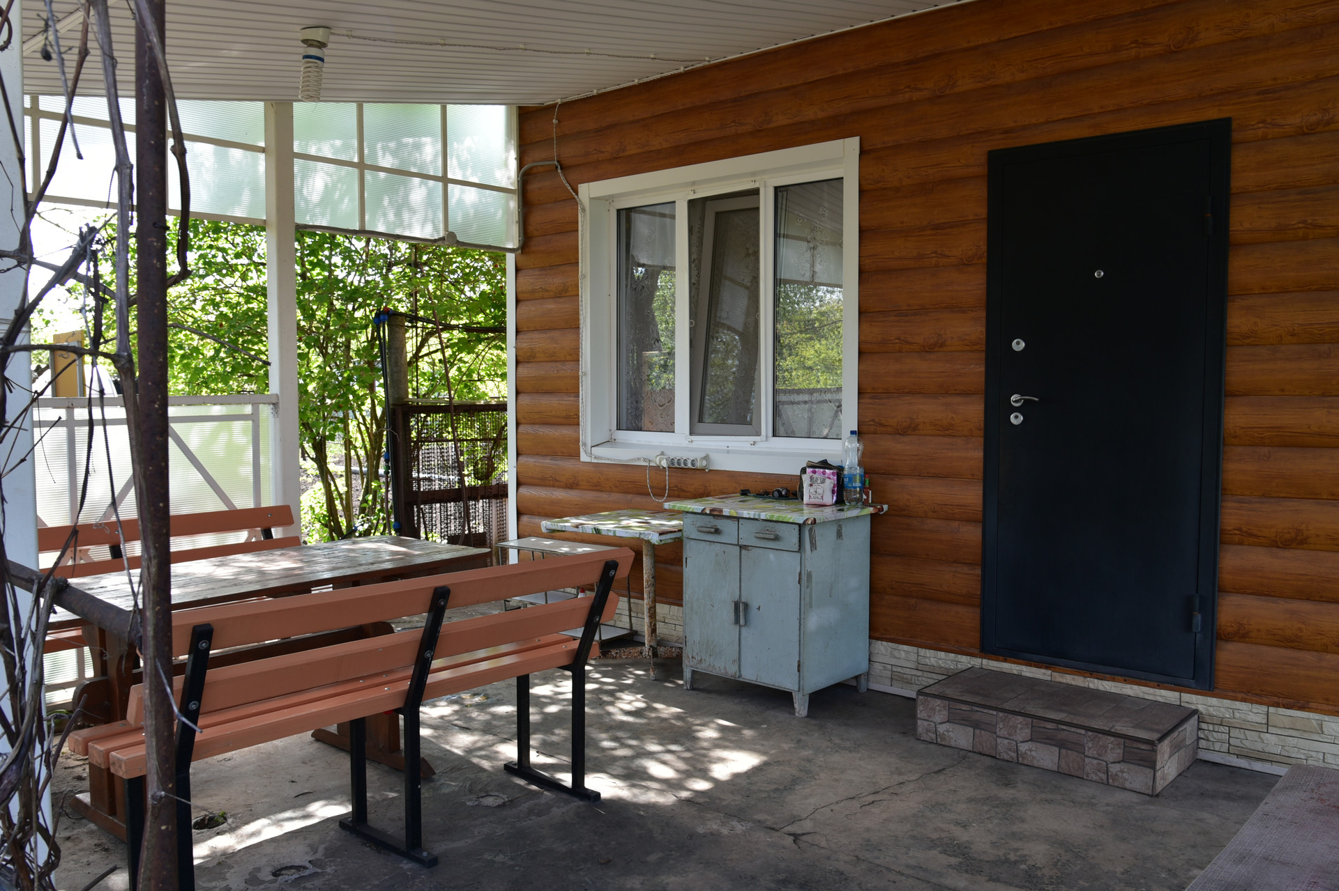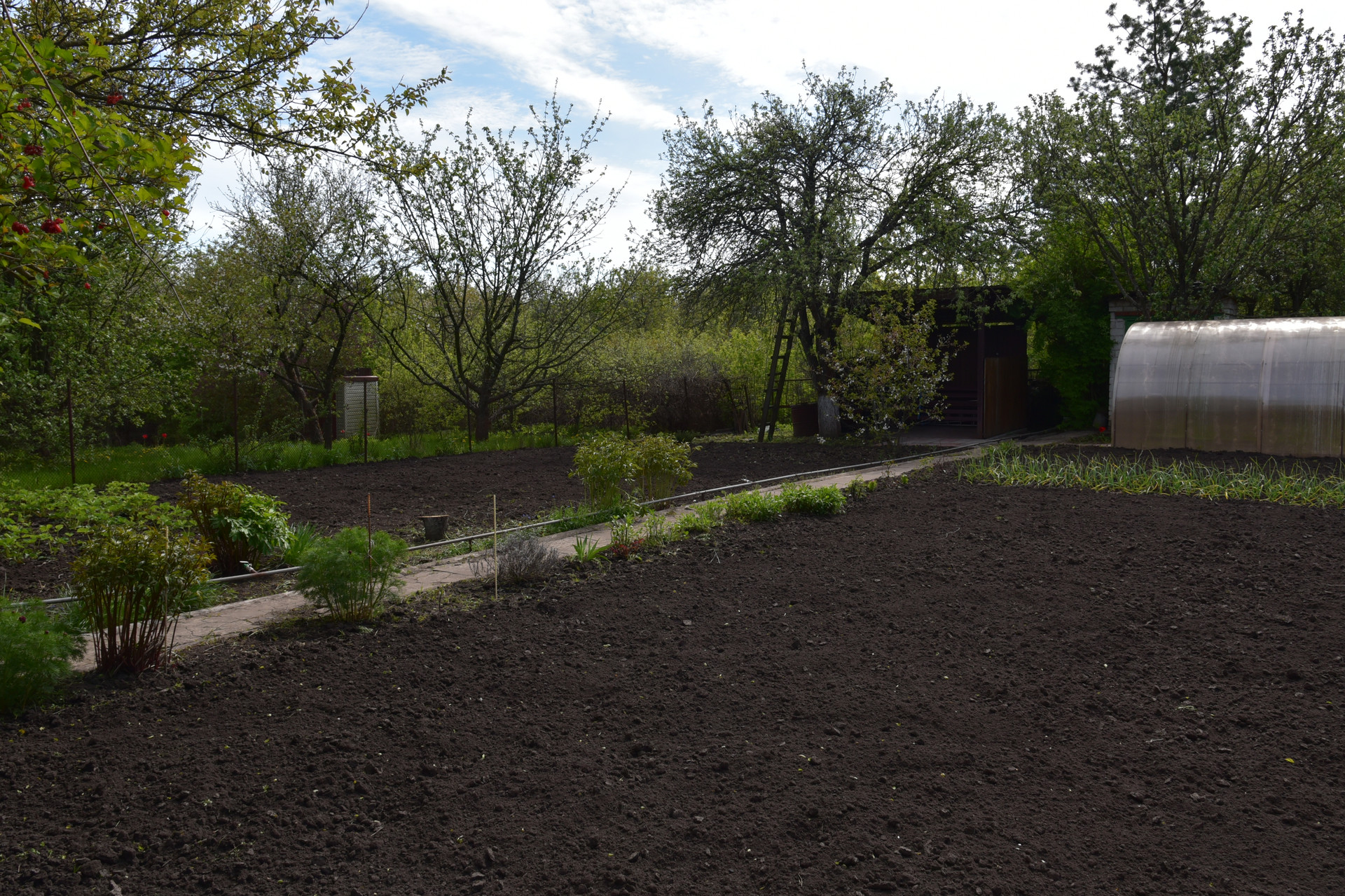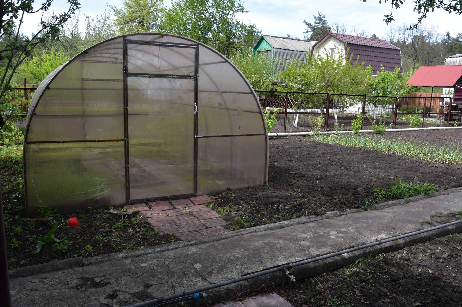 Теплица размером 3х4 м с автополивом. Емкость для воды объемом 2 куб. м. Хоз.помещение для хранения инвентаря, летний душ с подогревом воды, зона барбекю.