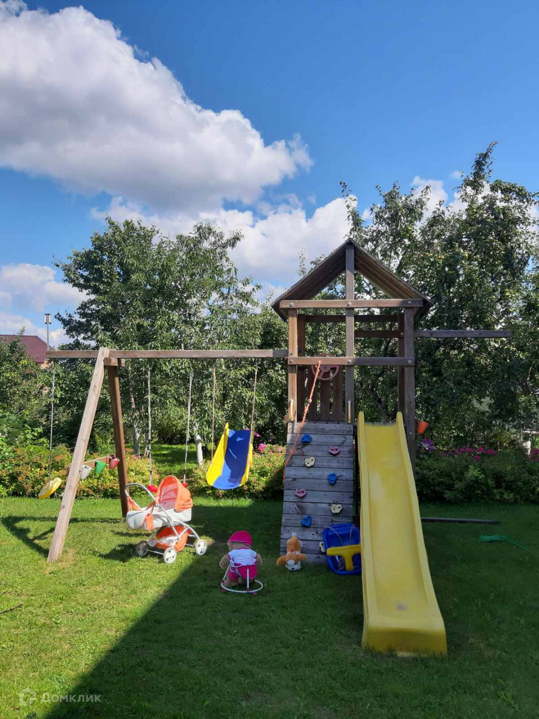 Отдельный выход в плодоносящий сад: яблони, груши, сливы, жимолость, черешня желтая и розовая, абрикосы, шелковица, малина, черная и красная смородина, черноплодная рябина, (клубника) земляника садовая ремонтантная, плодоносит с июня до сентября, большая теплица, беседка, море шикарных цветов: лилии, ирисы, гортензия метельчатая и обычная, розы, пионы, флоксы, тюльпаны, ландыши; а так же около дома находится детская площадка, два гаража и двухэтажная баня(брус)- на дровах, есть газовое отопление, двухконтурный котел.