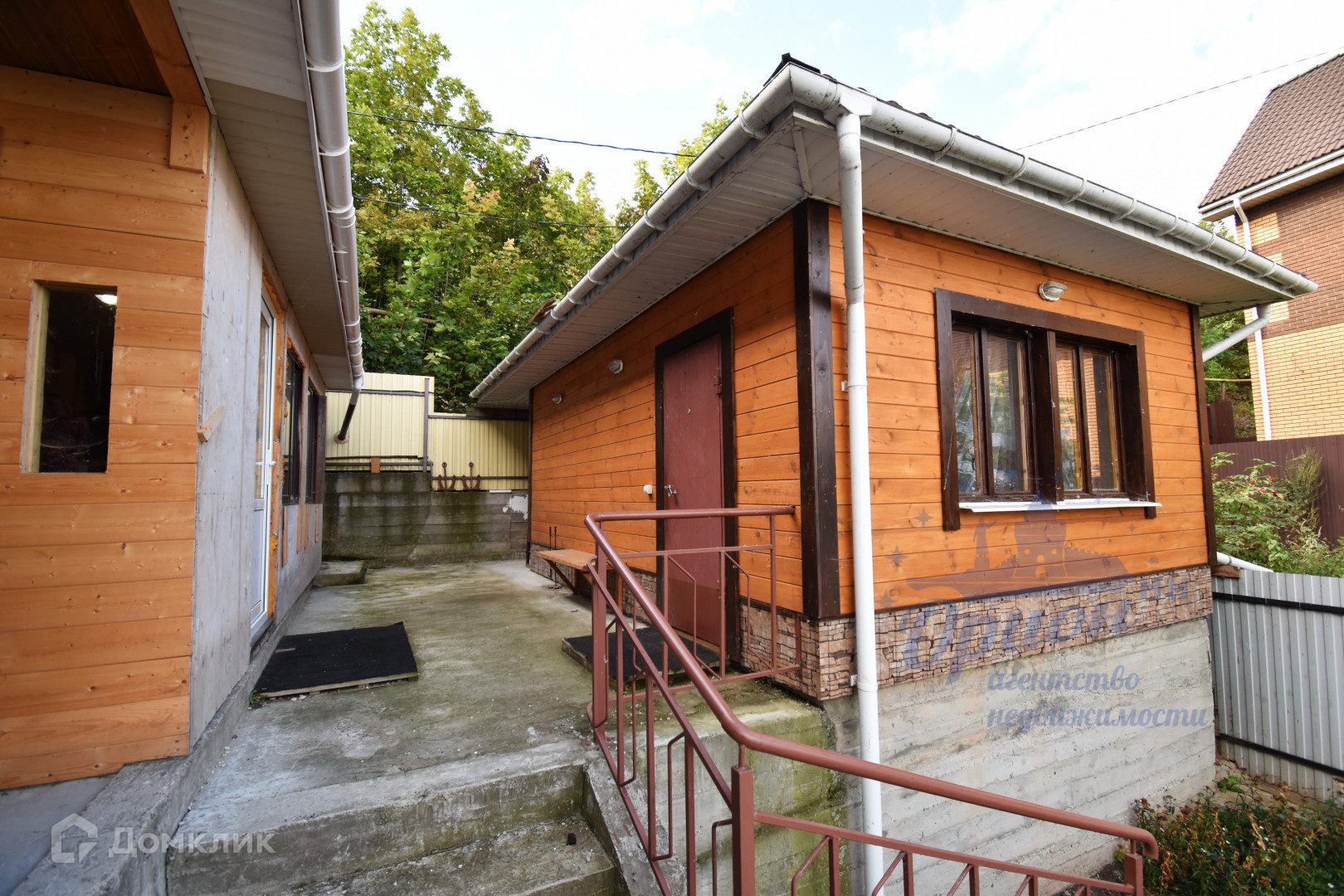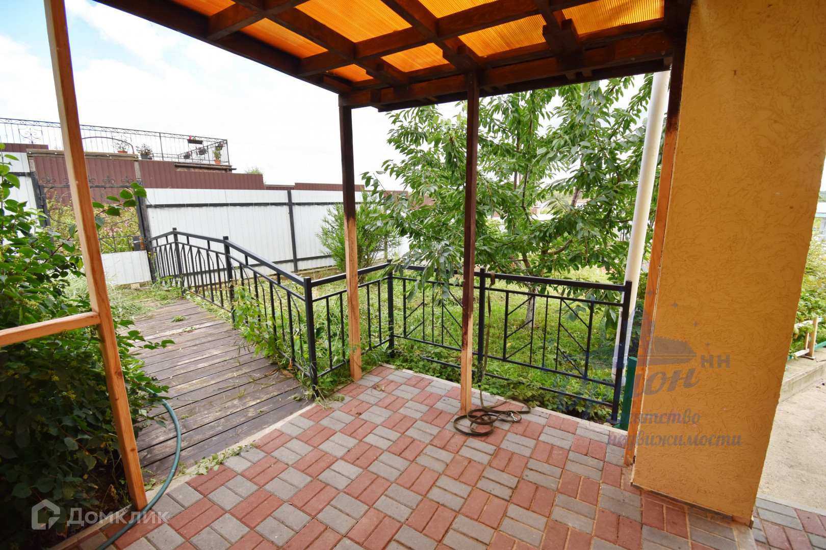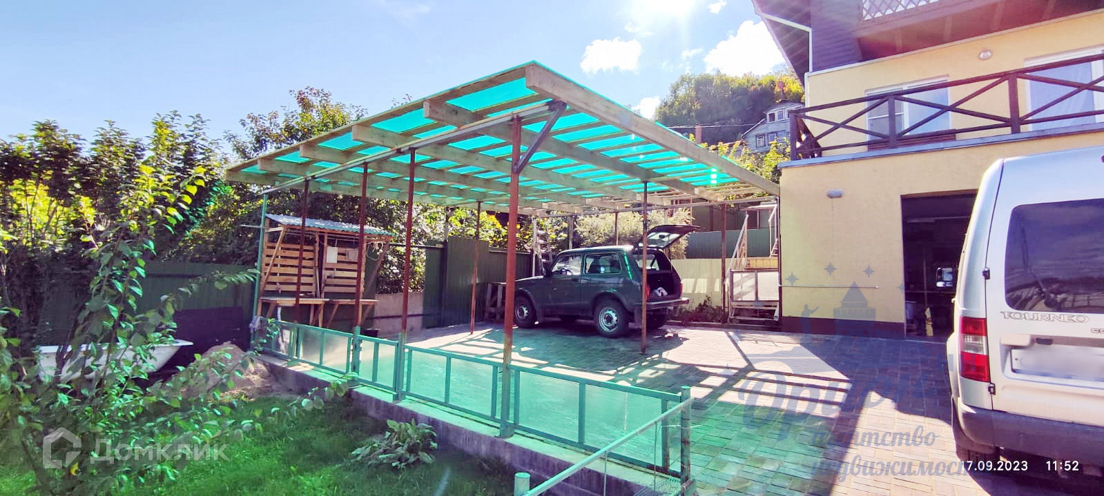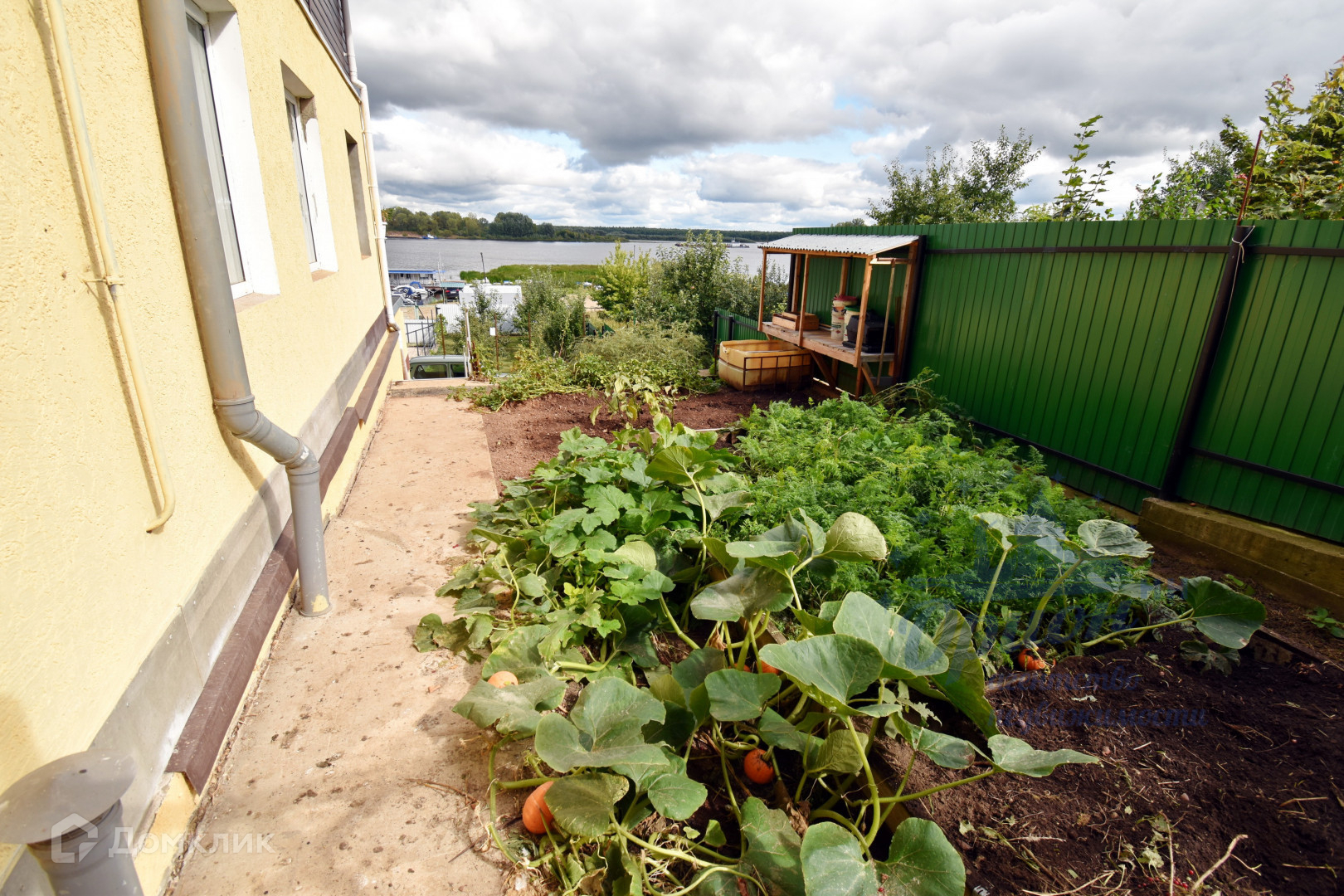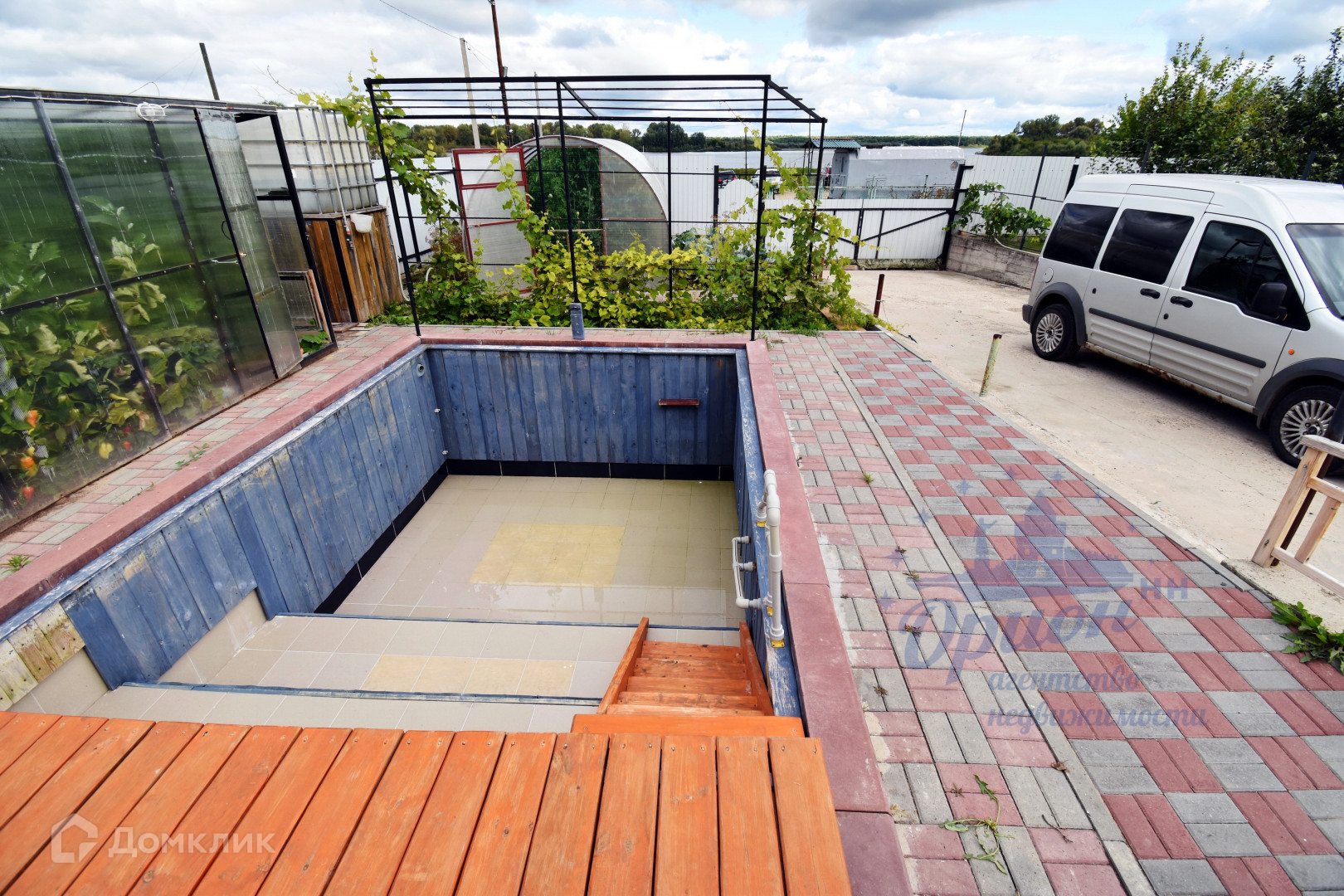 Участок перед домом забетонирован, часть участка, примыкающая к дому, выложена брусчаткой. Слева и справа от бетонной площадки ухоженные участки земли с теплицами и плодовыми деревьями.
