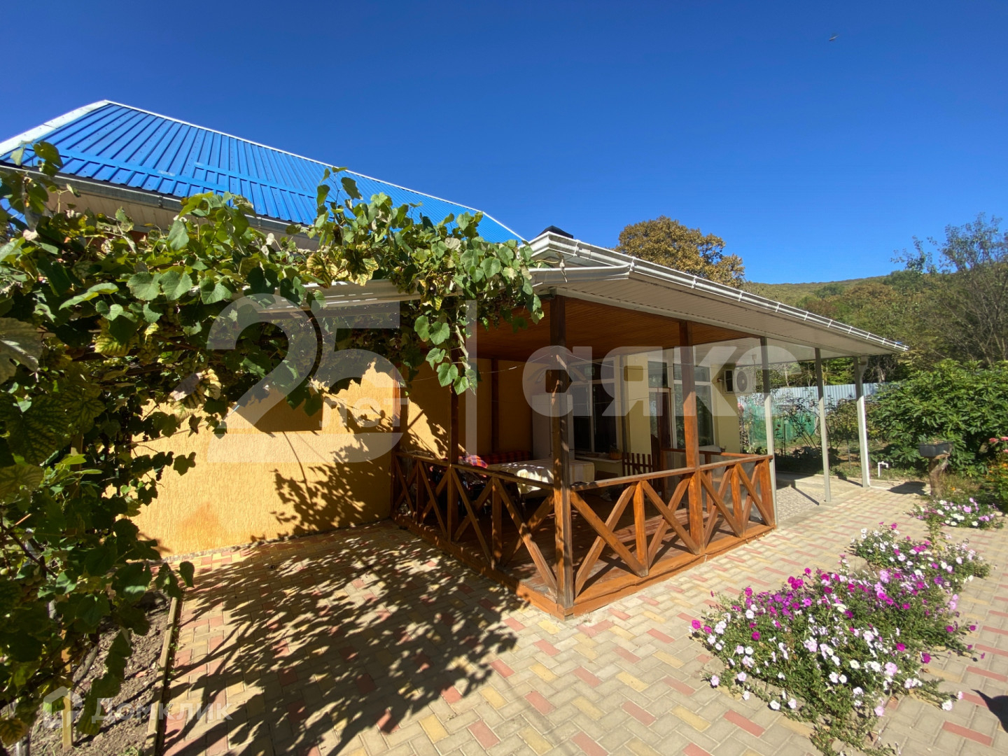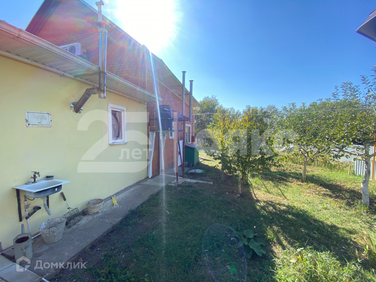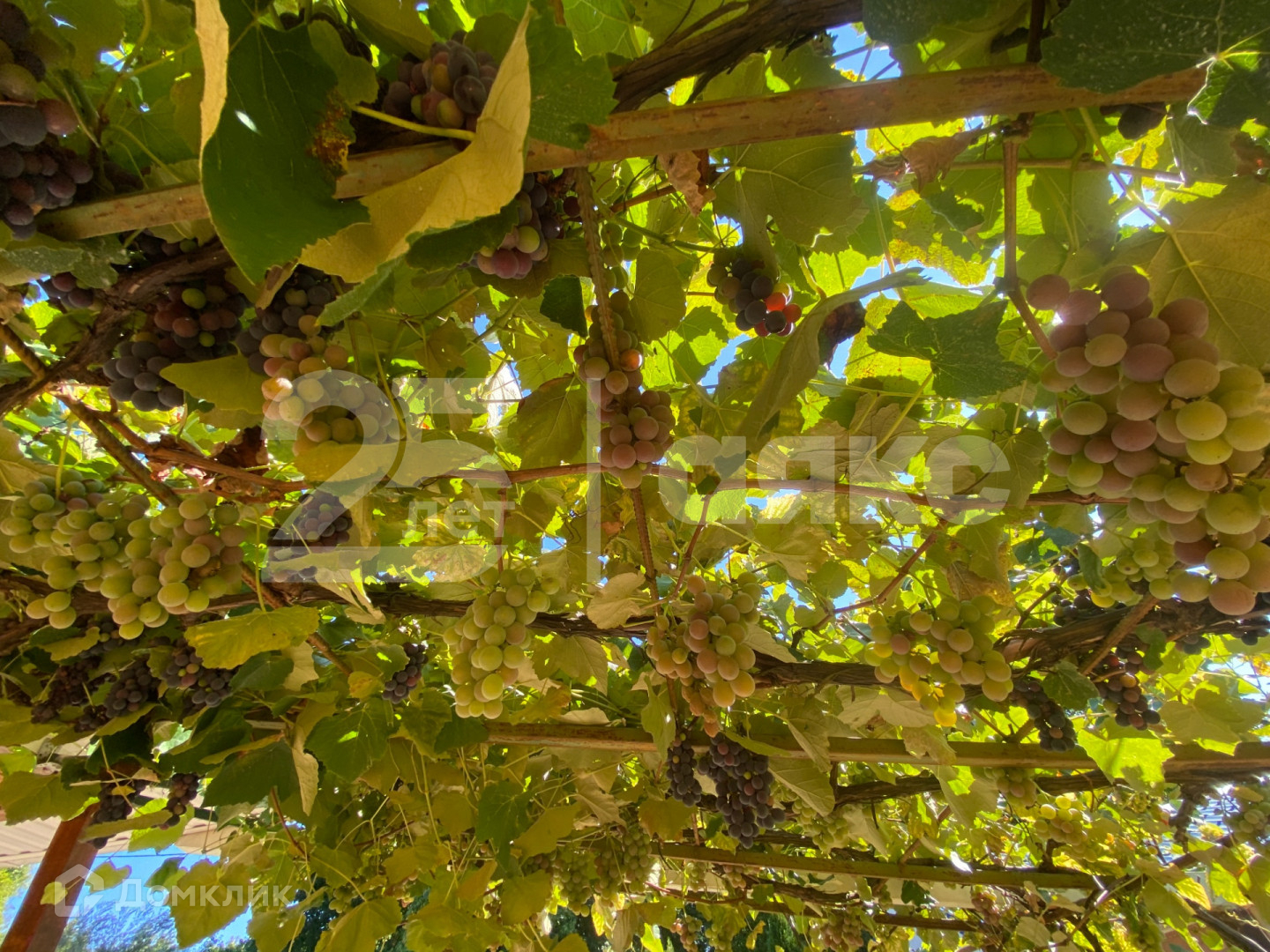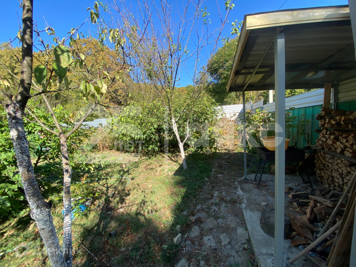 На участке растут плодовые деревья и виноград.