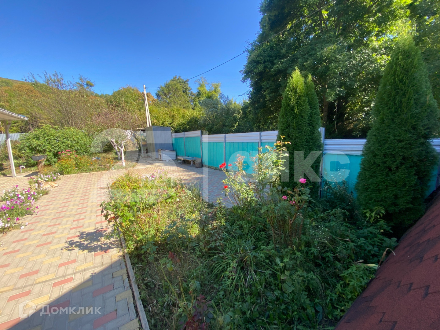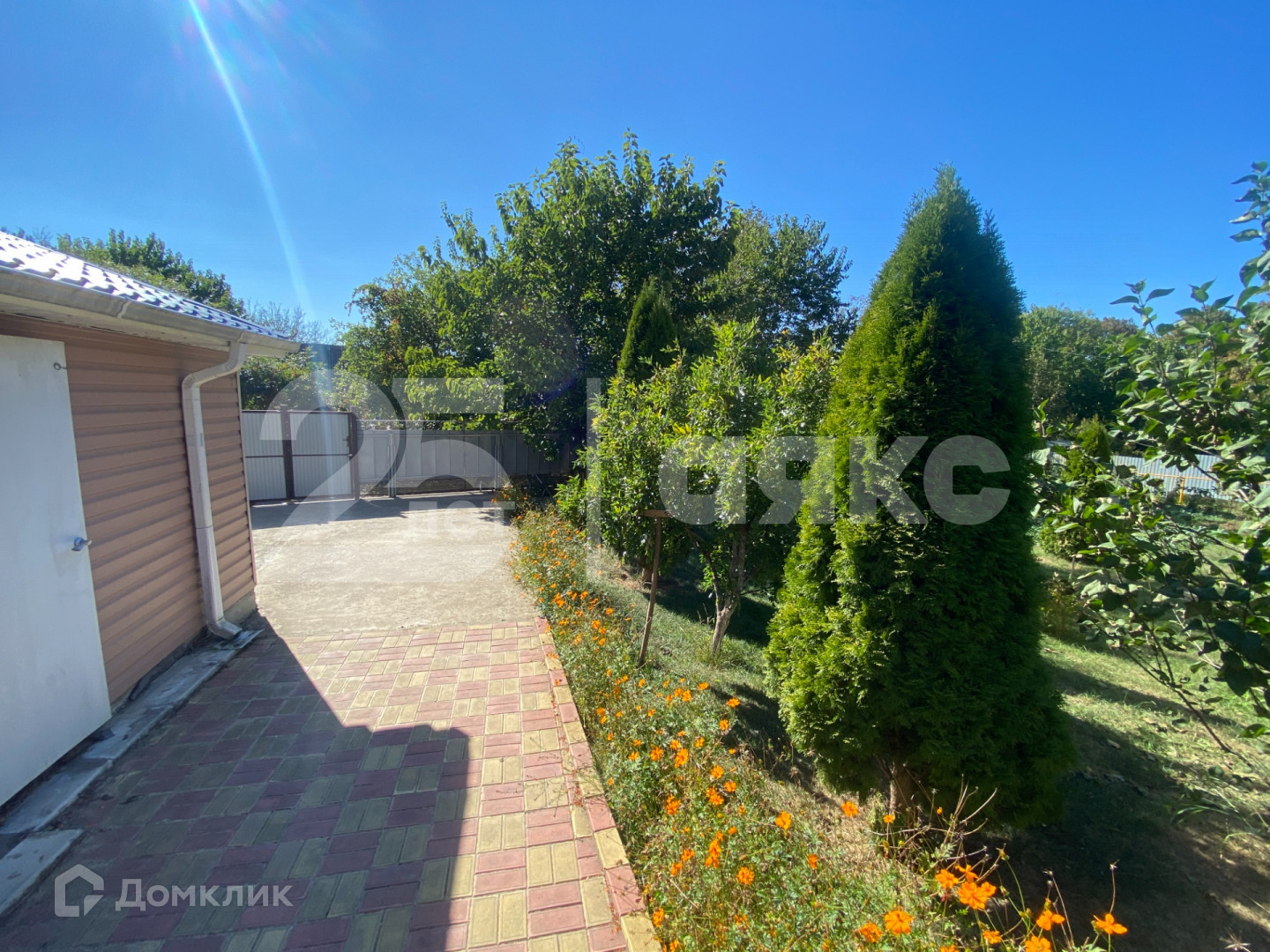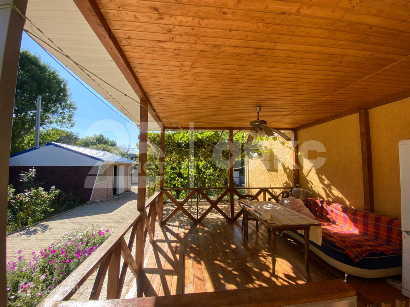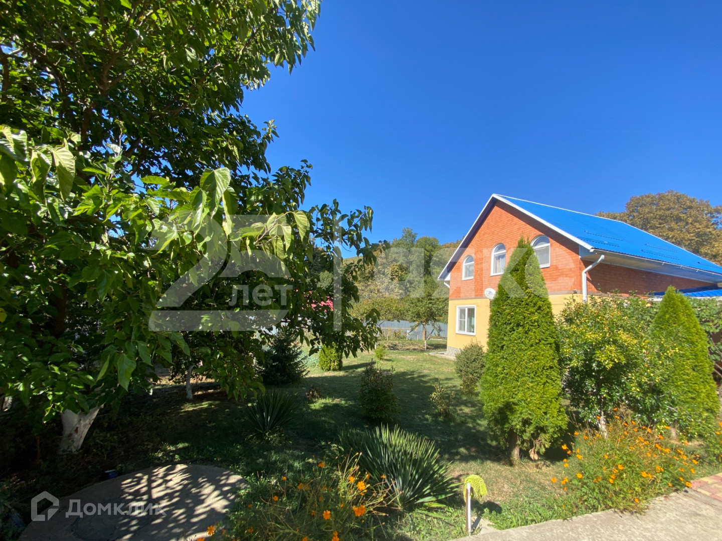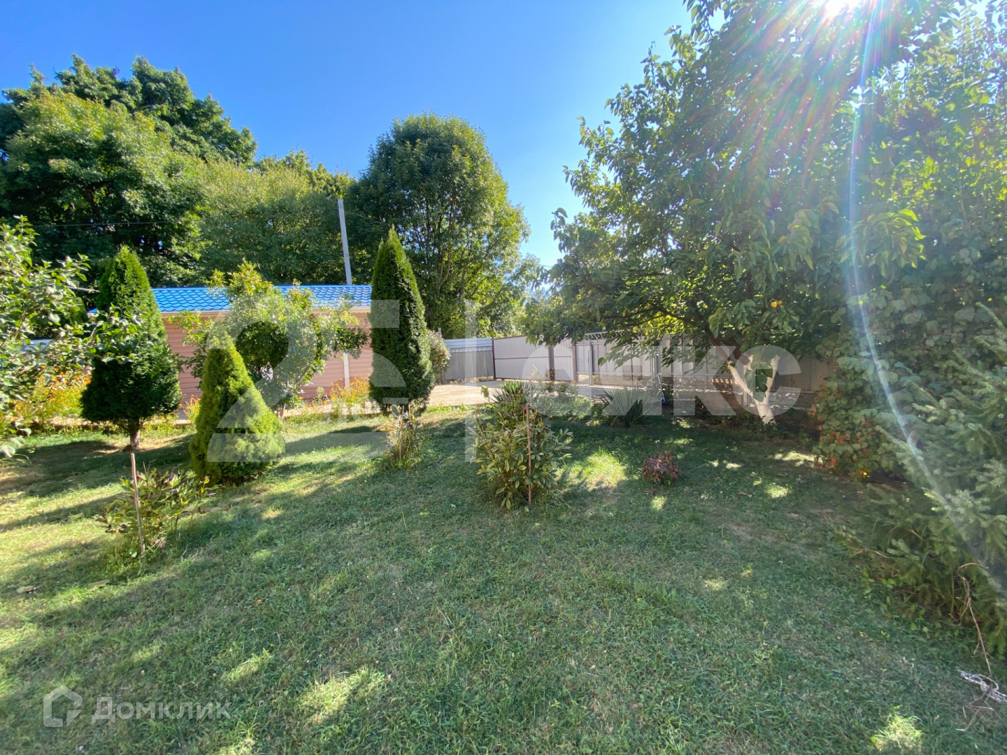 На участке растут плодовые деревья и виноград.