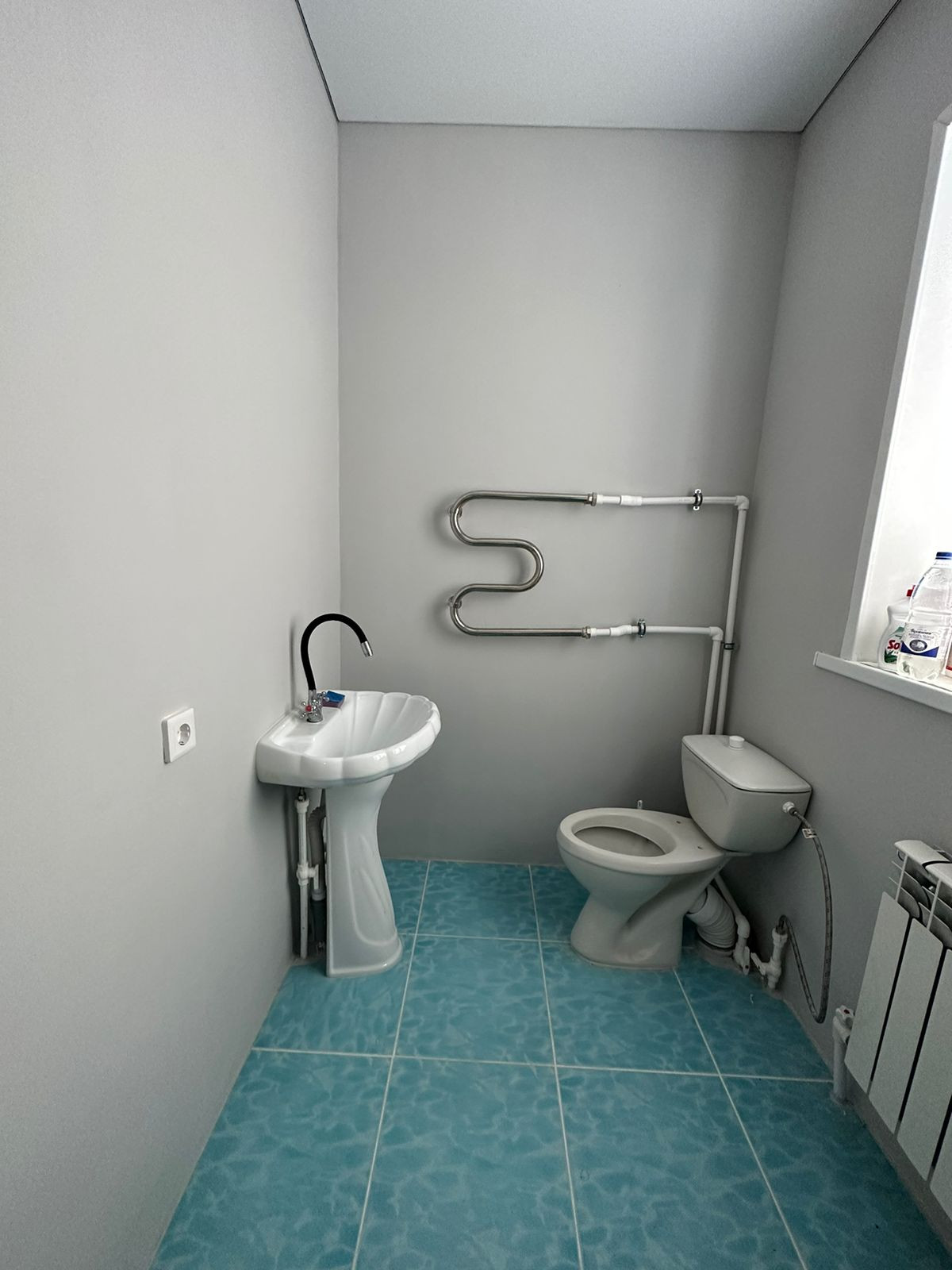 -сан-узел совмещеный установлена раковина и унитаз,на полу плитка стены покрашены водомимульсинной краской, есть выход для установки ванны  или душевой кабины.