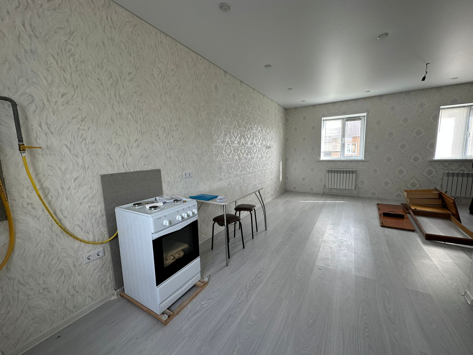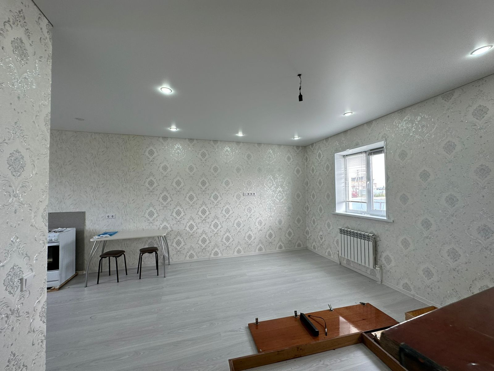 - большая гоcтинaя cовмещённая c  кухней из ремонта обoи,ламинат, натяжные потолки с точечным освещением.