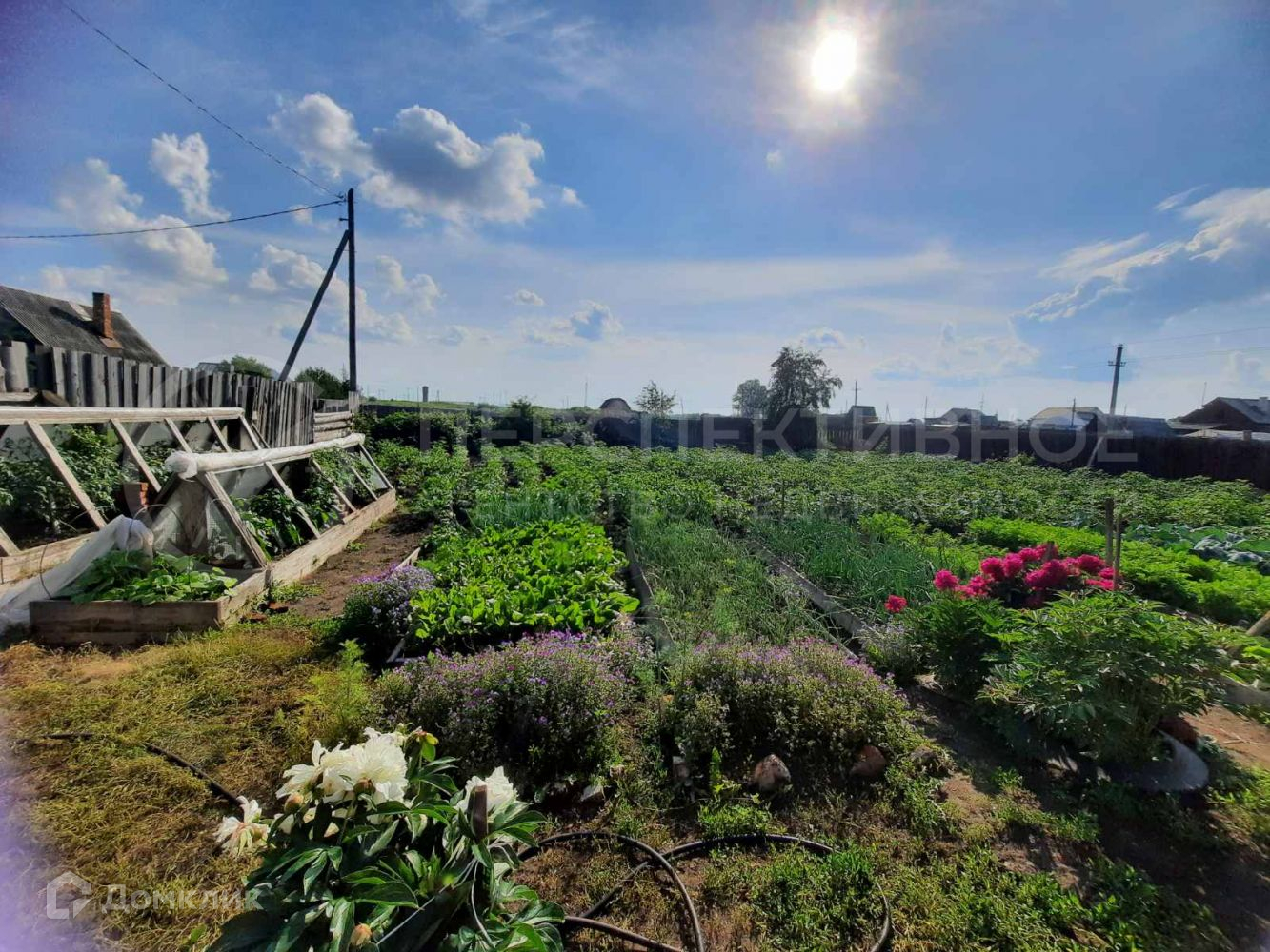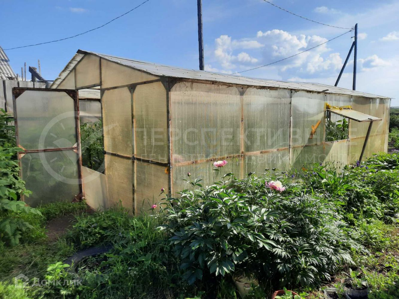 Есть теплица из поликарбоната, культурные насаждения.