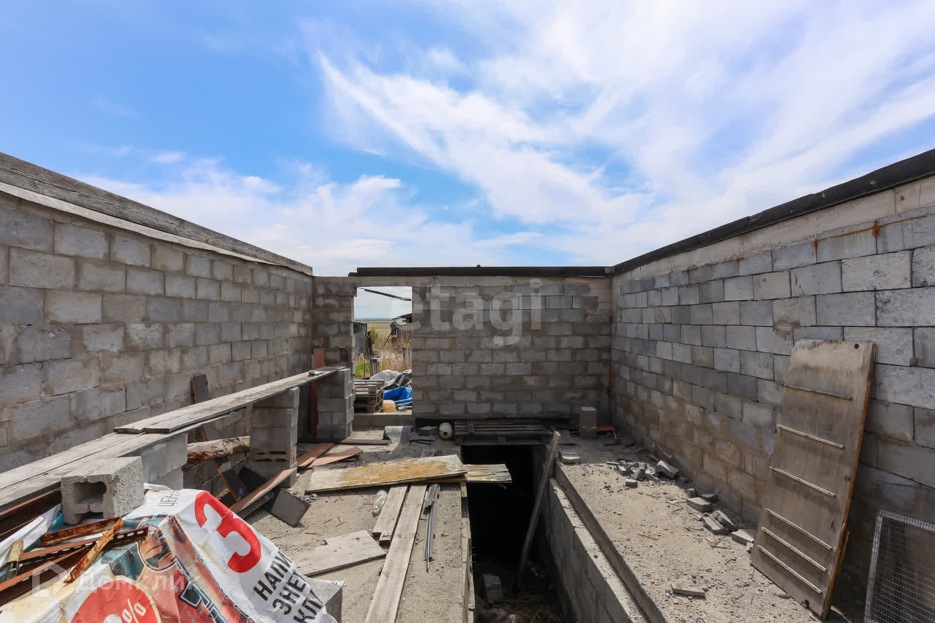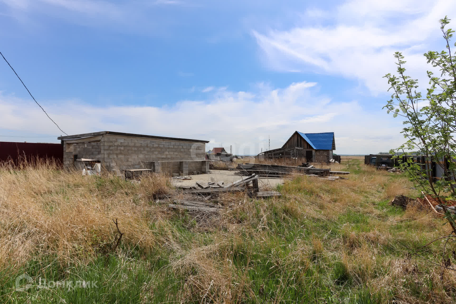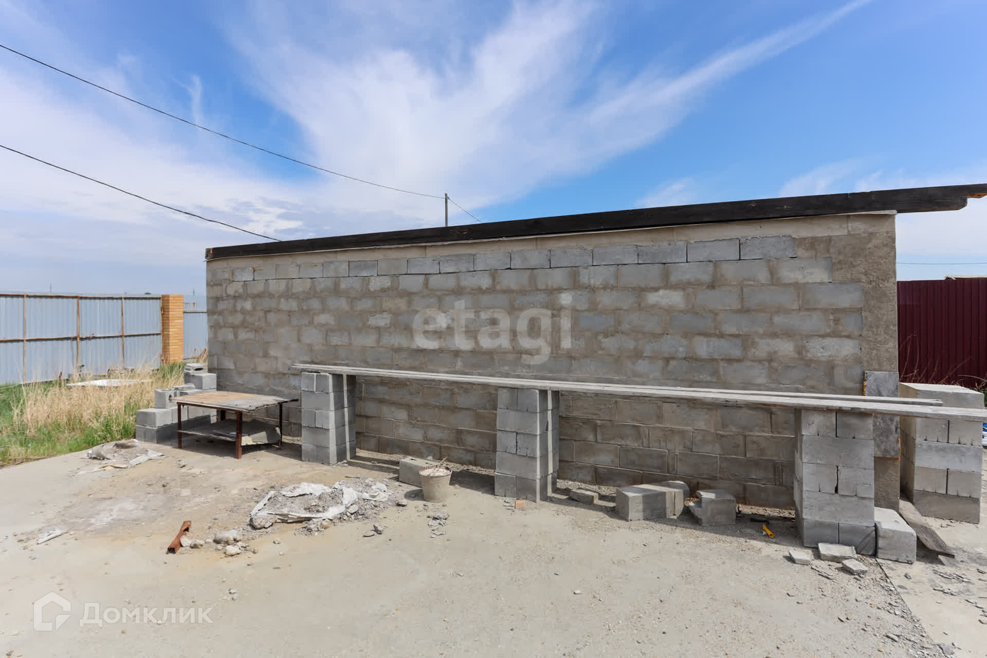 На территории участка монолитный фундамент с построенной коробкой из газоблока под гараж, оборудованный смотровой ямой. Осталось сделать крышу и установить ворота.