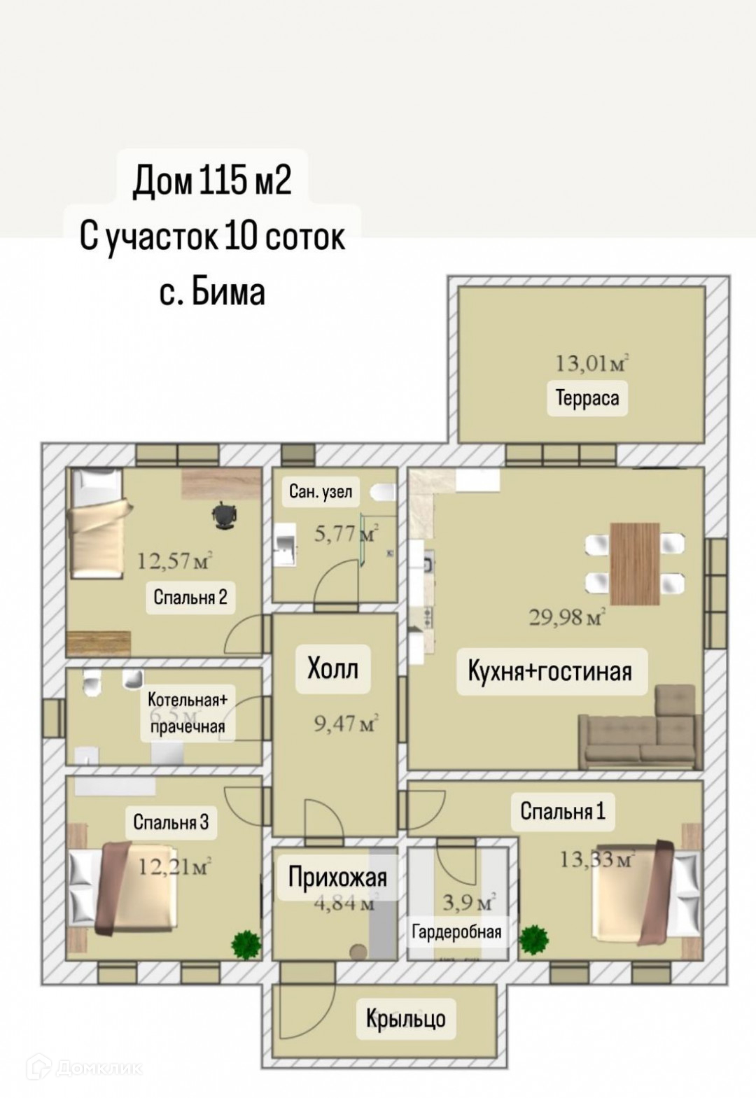 1-этажный дом, 115 м2, на продажу в селе Бима, улица Новосёлов