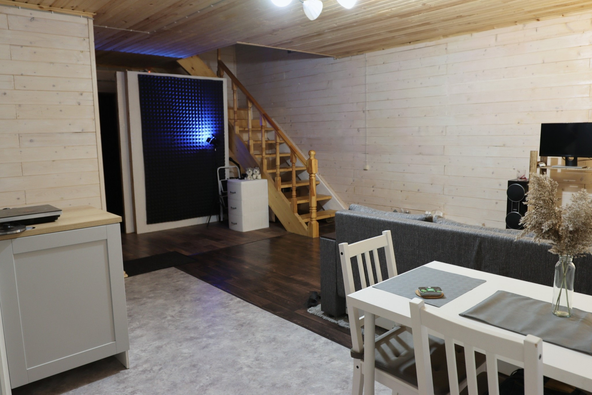 Дом из газобетона, фундамент монолитная плита, кровля ондулин, внутрення отделка имитацией бруса, внешняя - сайдинг, пластиковые окна. На первом этаже прихожая, санузел, кухня-гостинная, на втором этаже две комнаты.