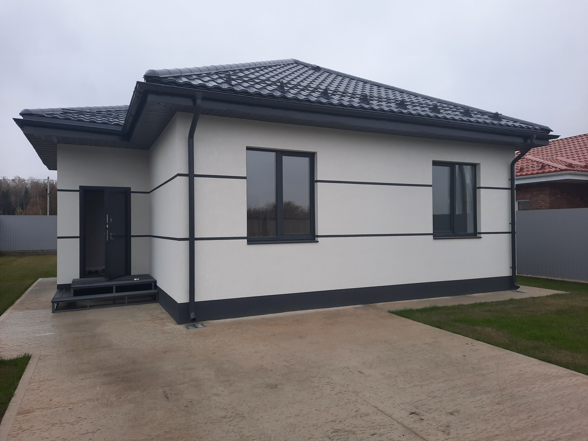 Крыша из стальных листов Grand Line, включая сафиты и ливневые трубы, обеспечивающие защиту от непогоды и долговечность.