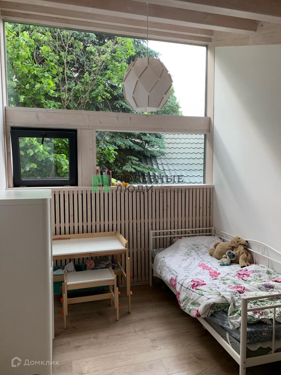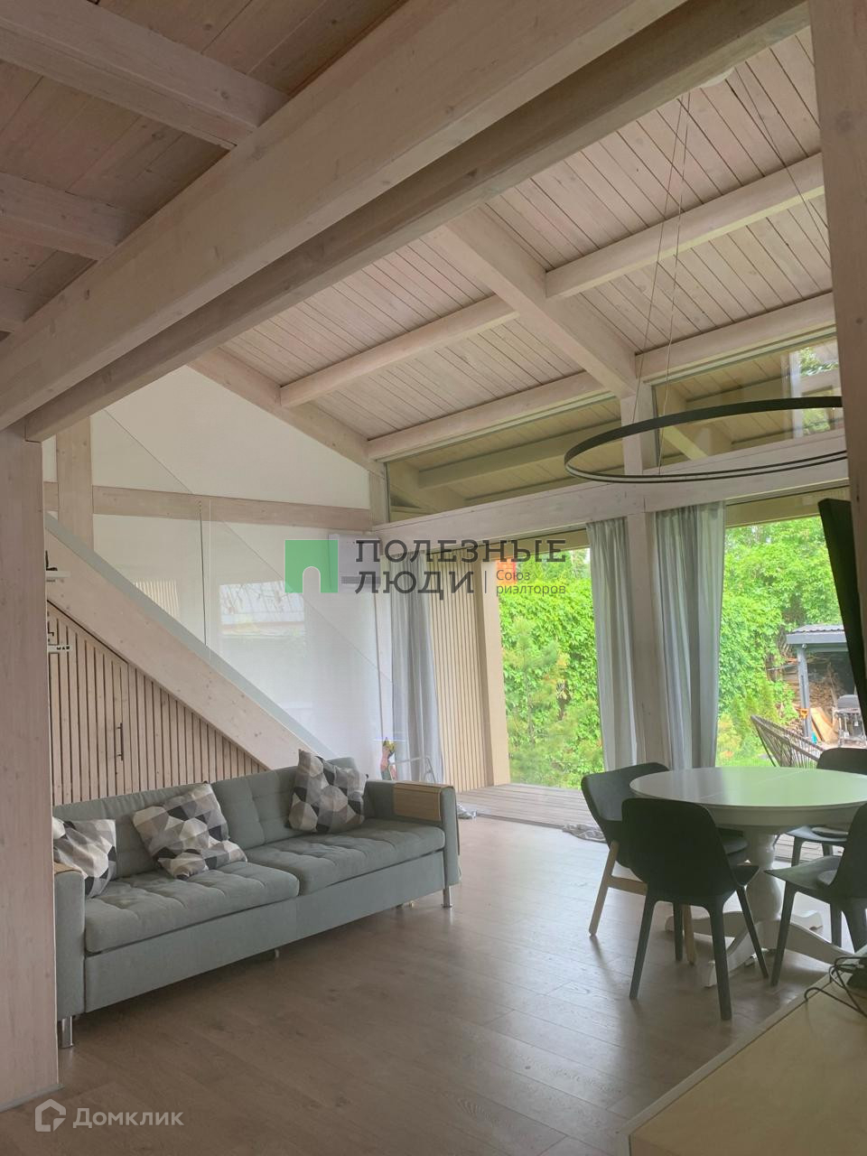 На первом этаже находится большая кухня-гостиная, спальная комната и санузел