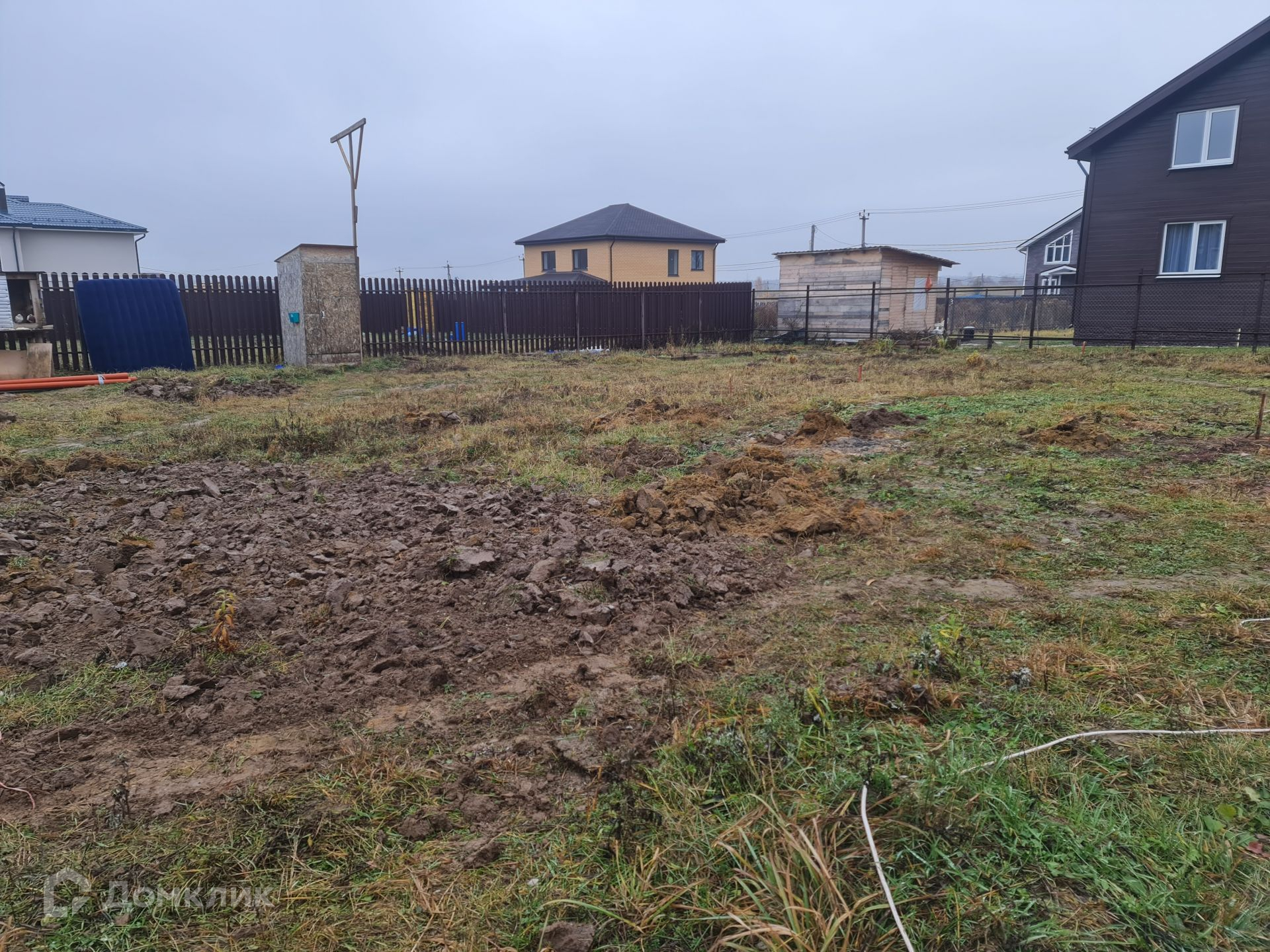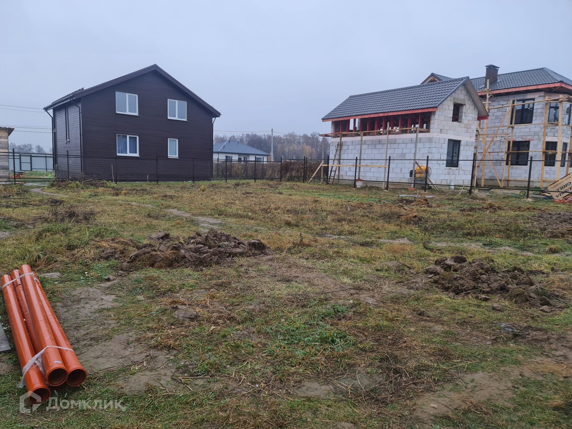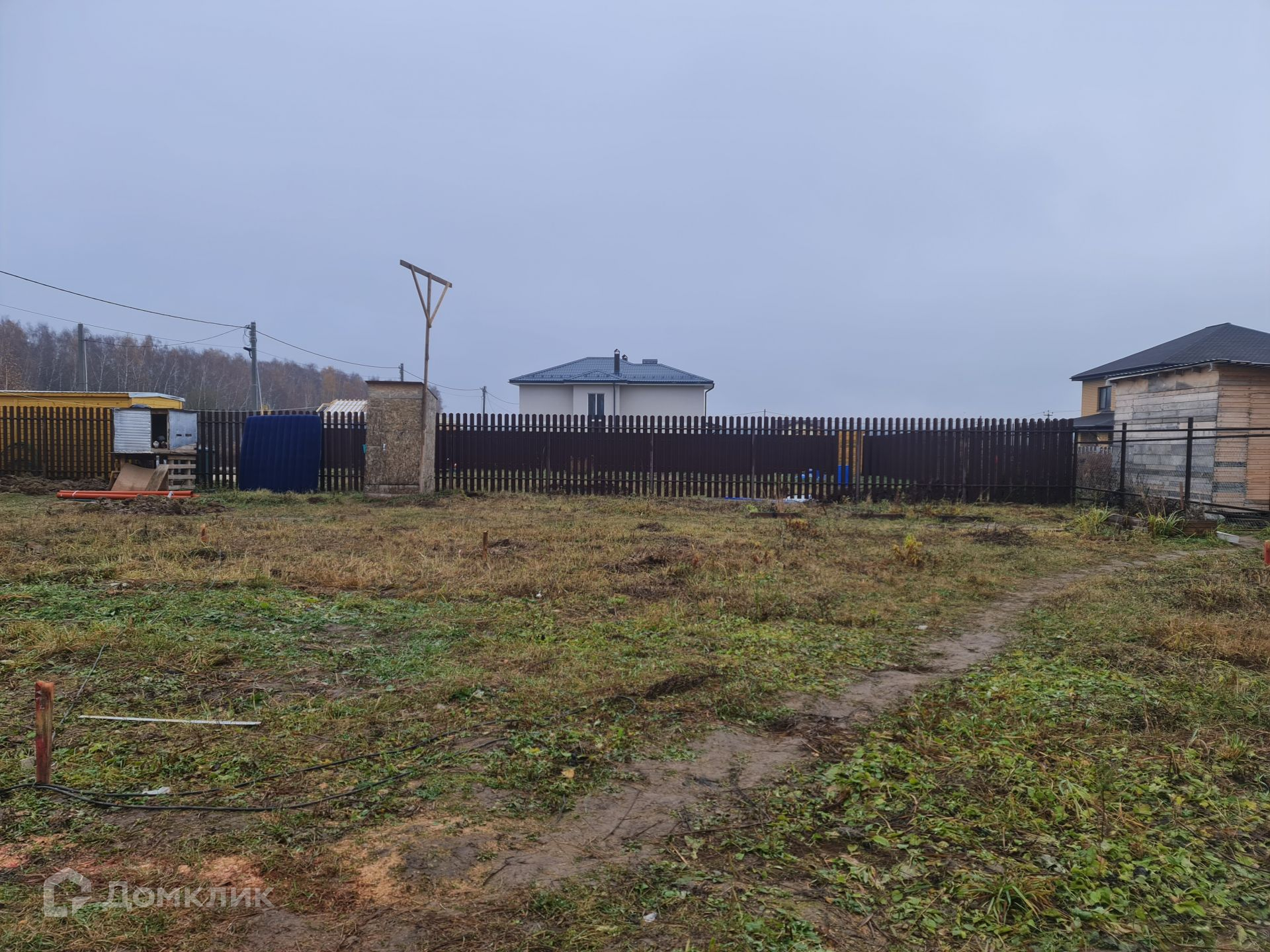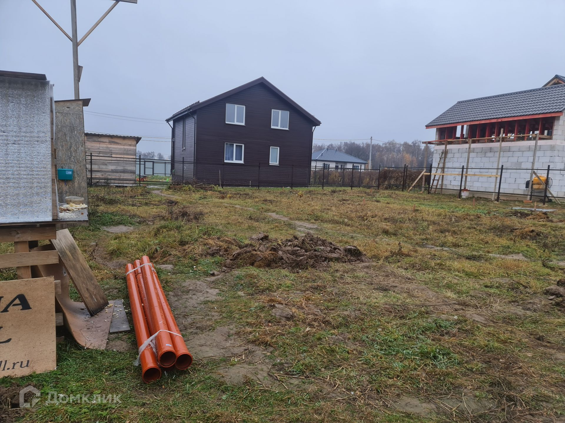 На въезд уложена толстостенная, железная труба шириной 7 м. В ближайшее время будет отсыпана площадка для парковки и входа, шириной 9 м, глубиной 6 м. Установлены и покрашены столбы и лаги для забора, осталось только зашить, задняя и фасадная сторона проф-лист с боков евроштакетник. Установлены столбы на ворота и калитку.