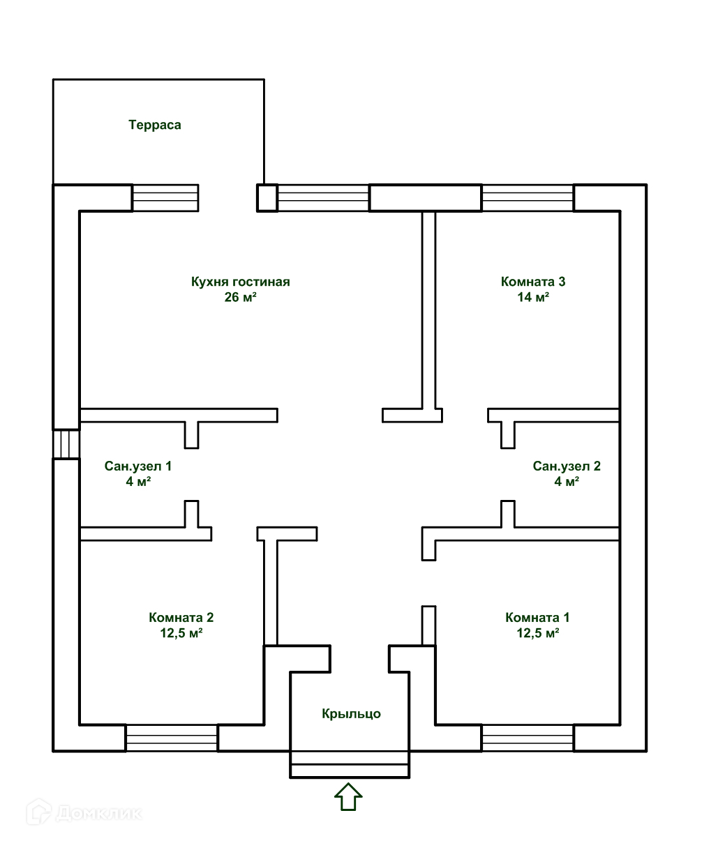 Кухня-гоcтинaя 26 м2 с выходом на террасу, 3 комнаты, 2 санузла.