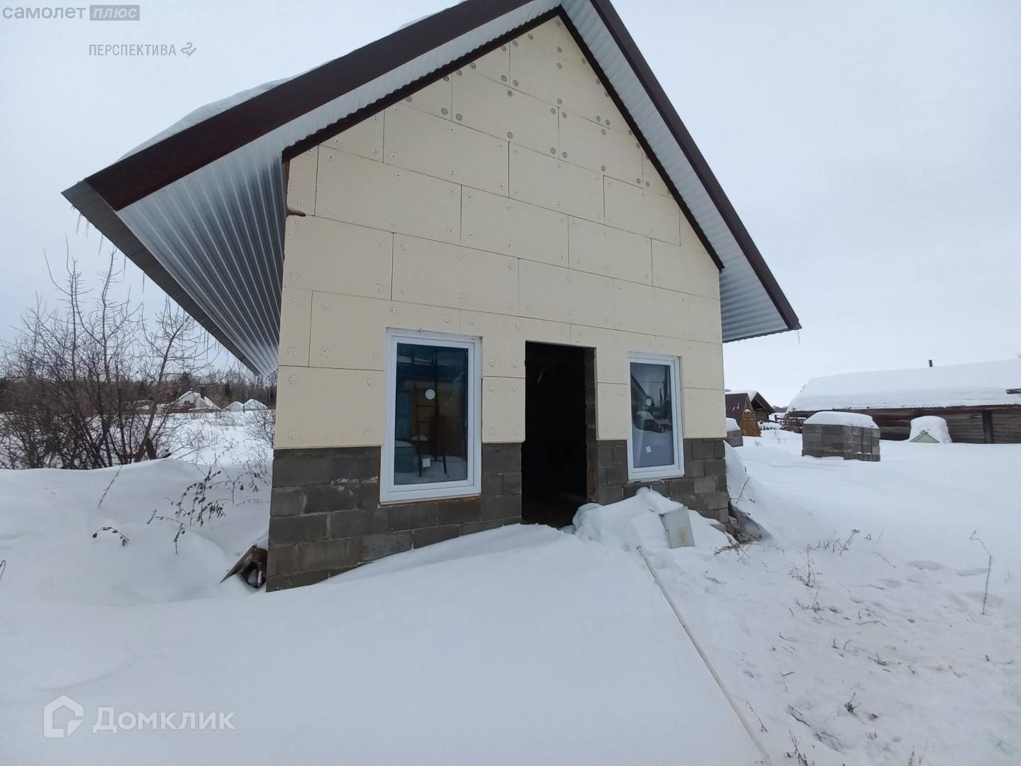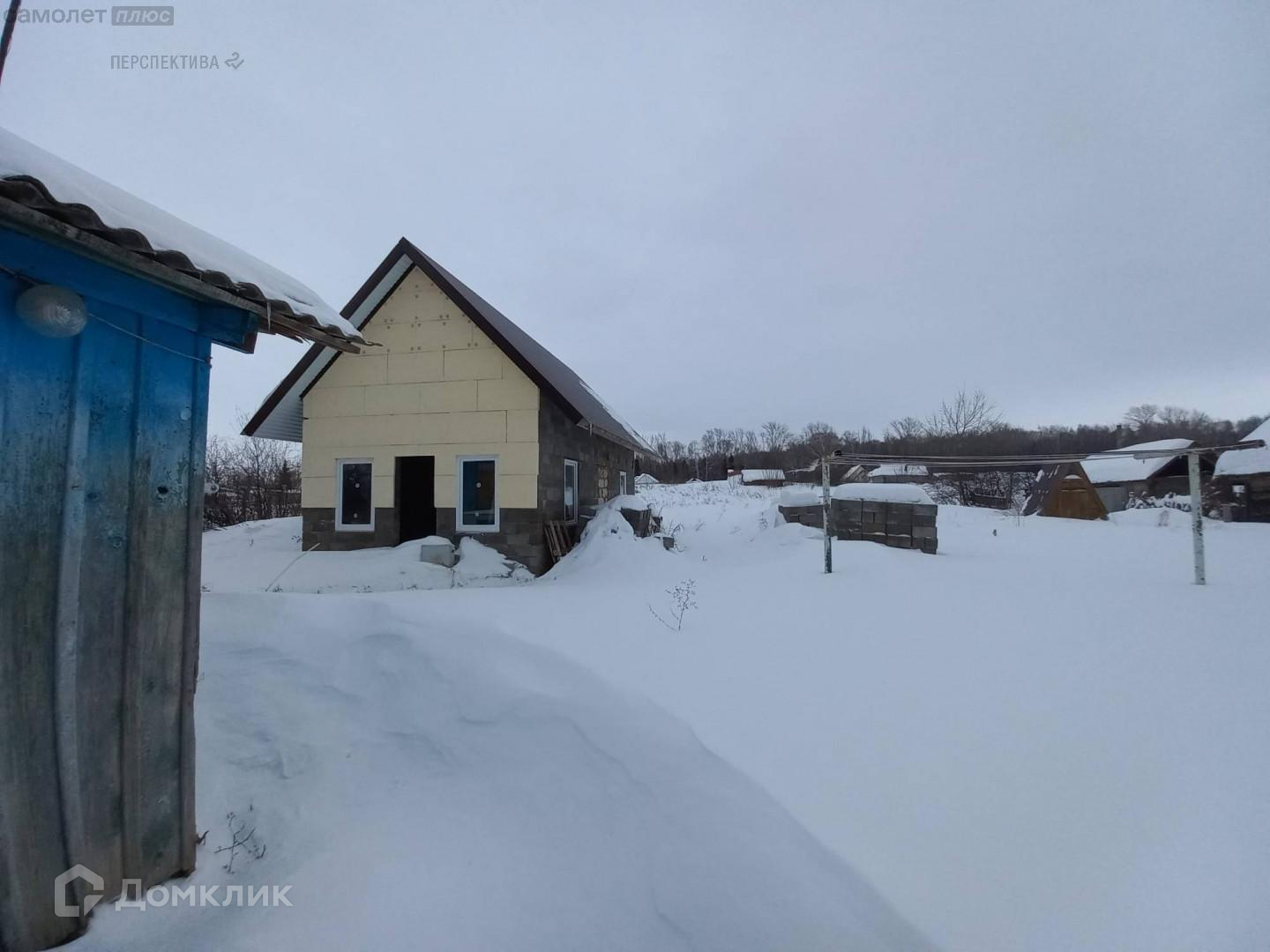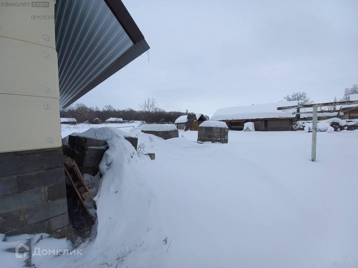 На территории двора есть новый гараж и возведенная из газоблоков баня (под высокой крышей и установленными окнами).