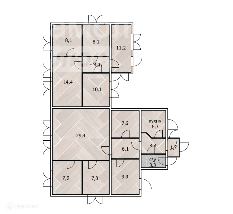 3 спальни -9,9 кв.м, 7,9 кв.м, 7,8 кв.м.,