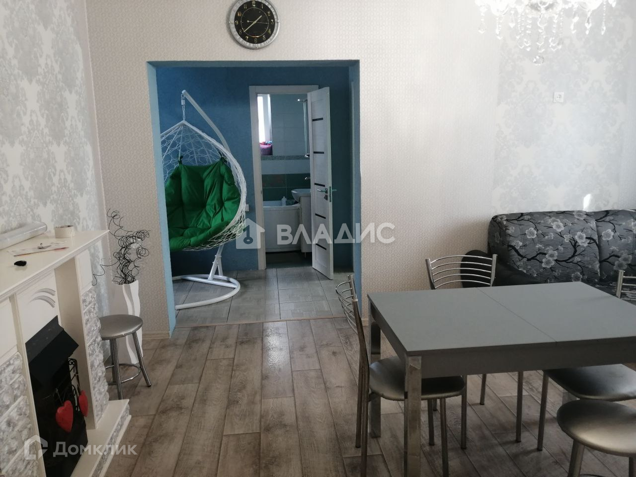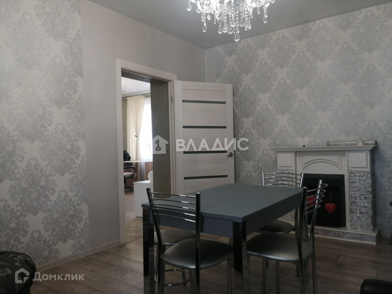 Зал: большой раскладной диван, обеденный стол, электрический камин.