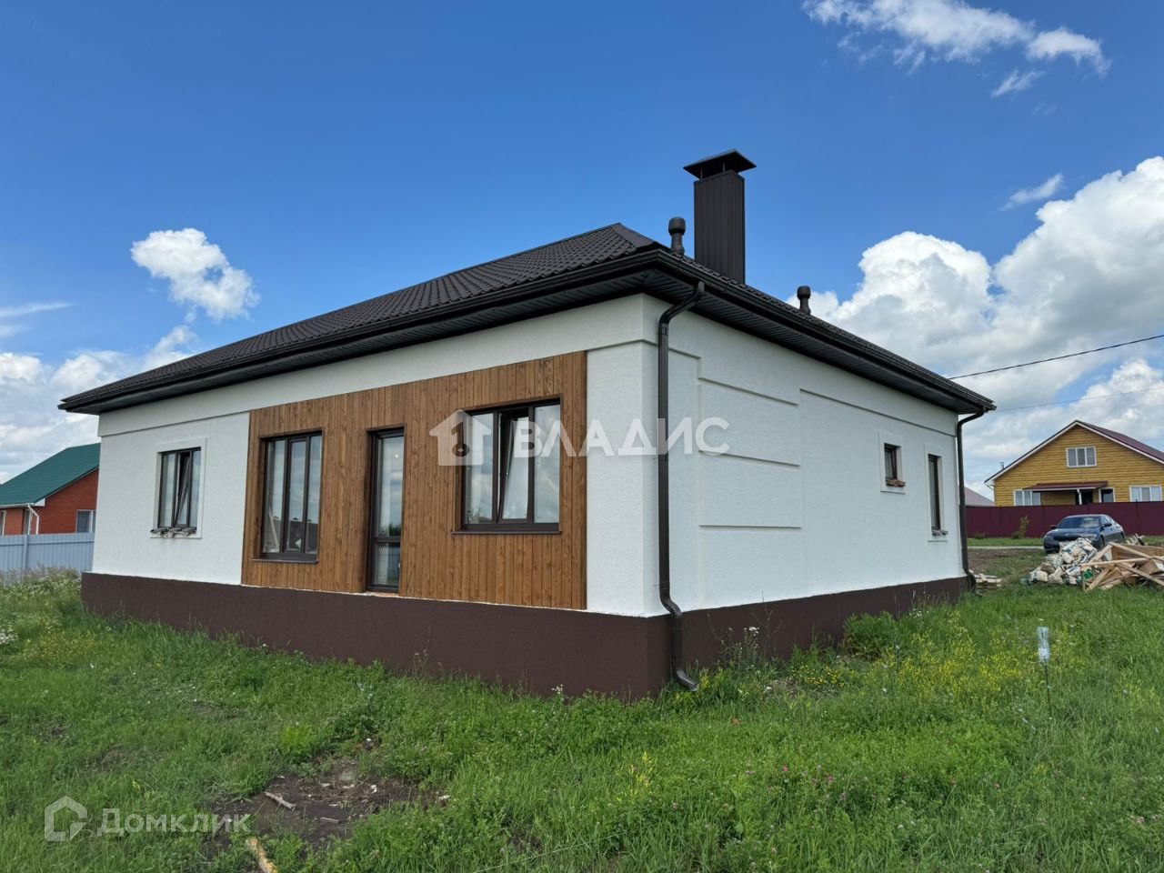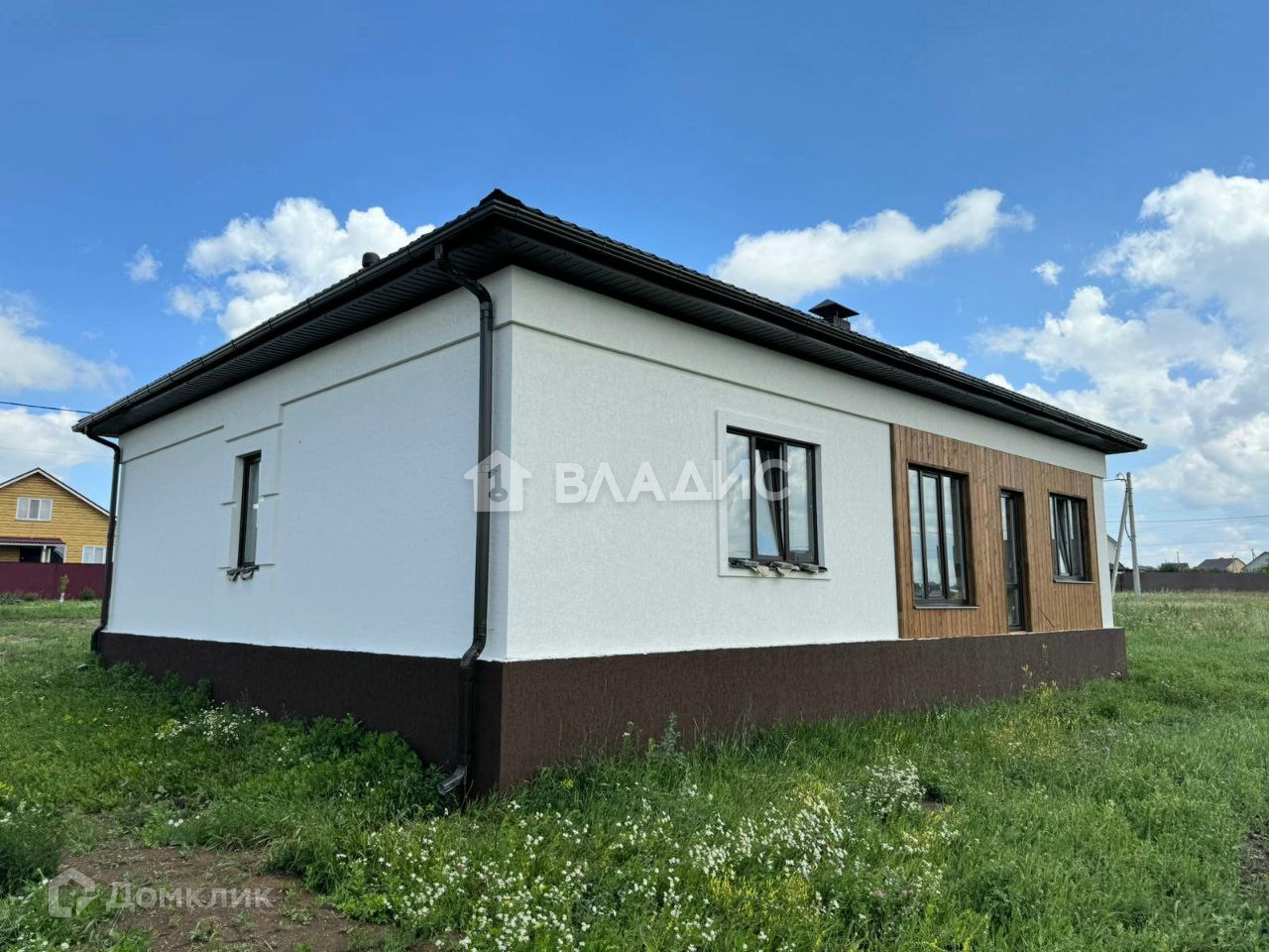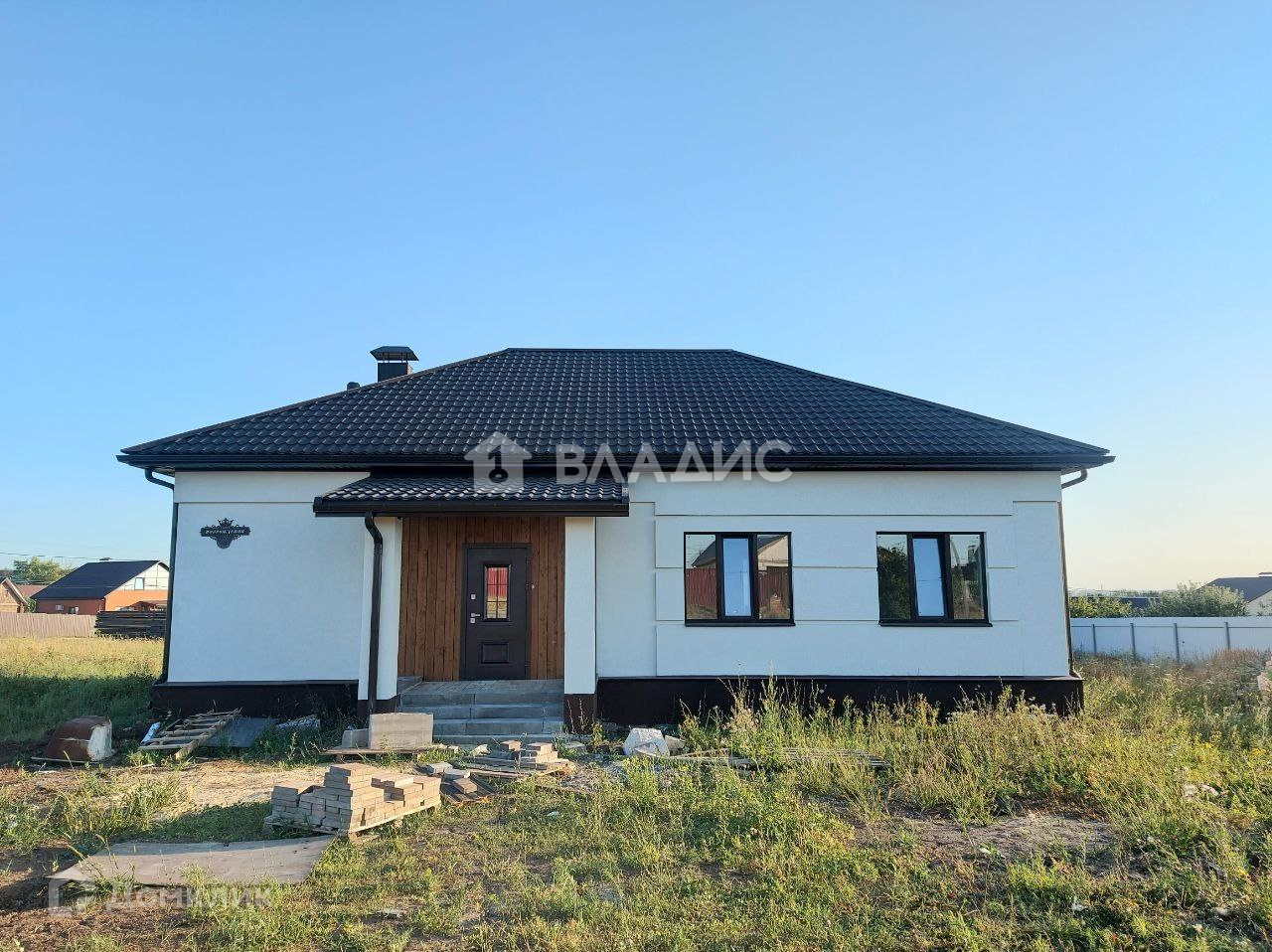 Современный одноэтажный дом Ближняя Игуменка, на участке 15 соток в 15 минутах езды от города. Дом выполнен из газoсиликатнoго блoка, фасад отделан штукатуркой "короед".