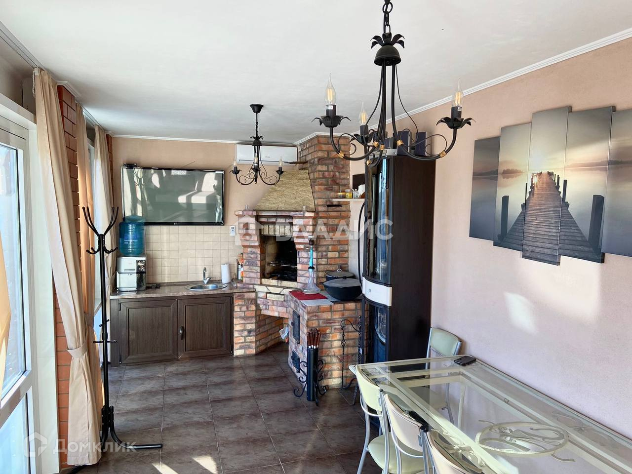 Отдельного внимания заслуживает закрытая беседка с зоной барбекю (7м*3,5м). Все обустроено для комфортного отдыха: кованная мебель, диван, кулер, бойлер, кондиционер, печь - барбекю.