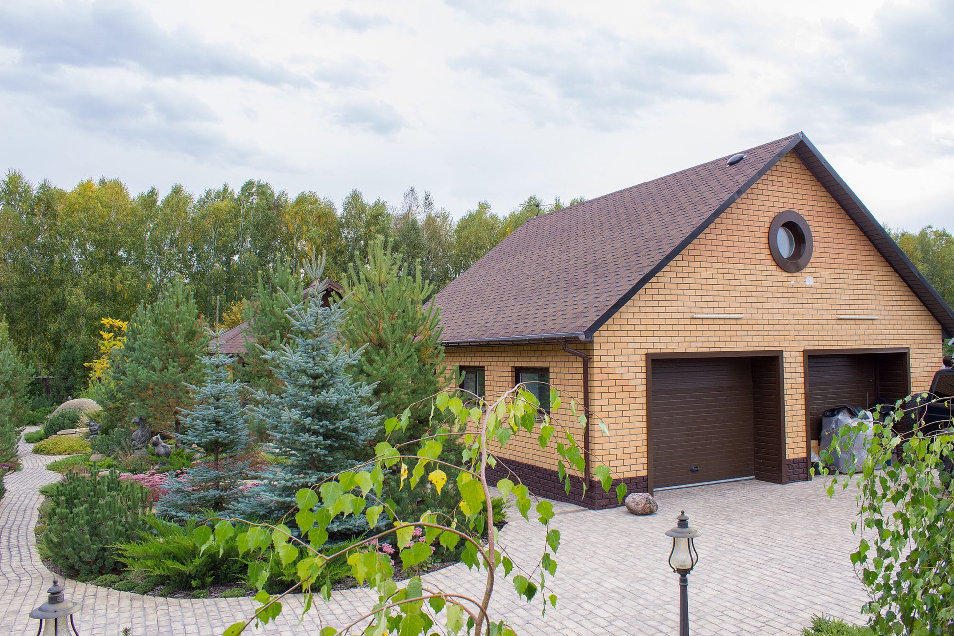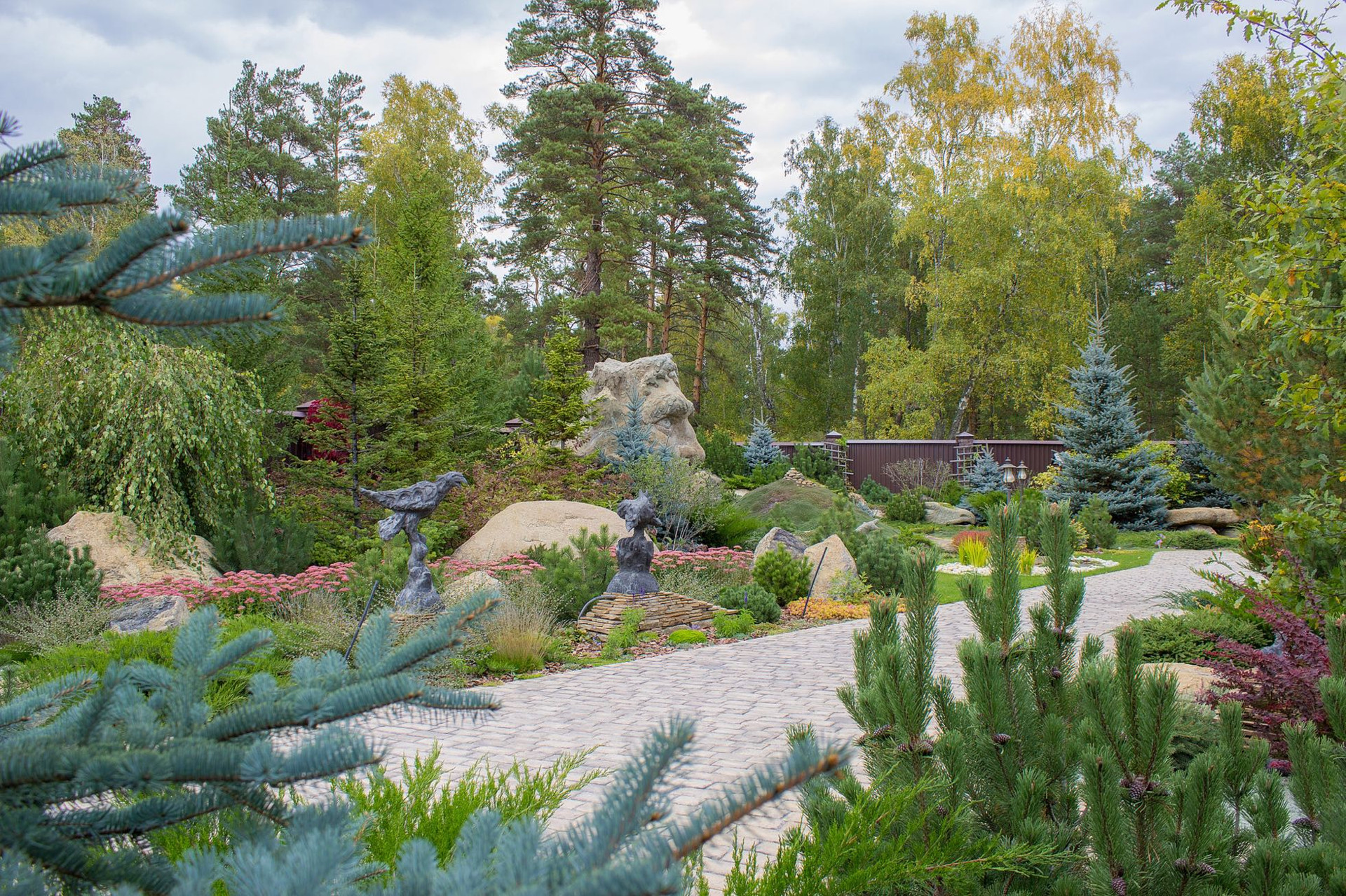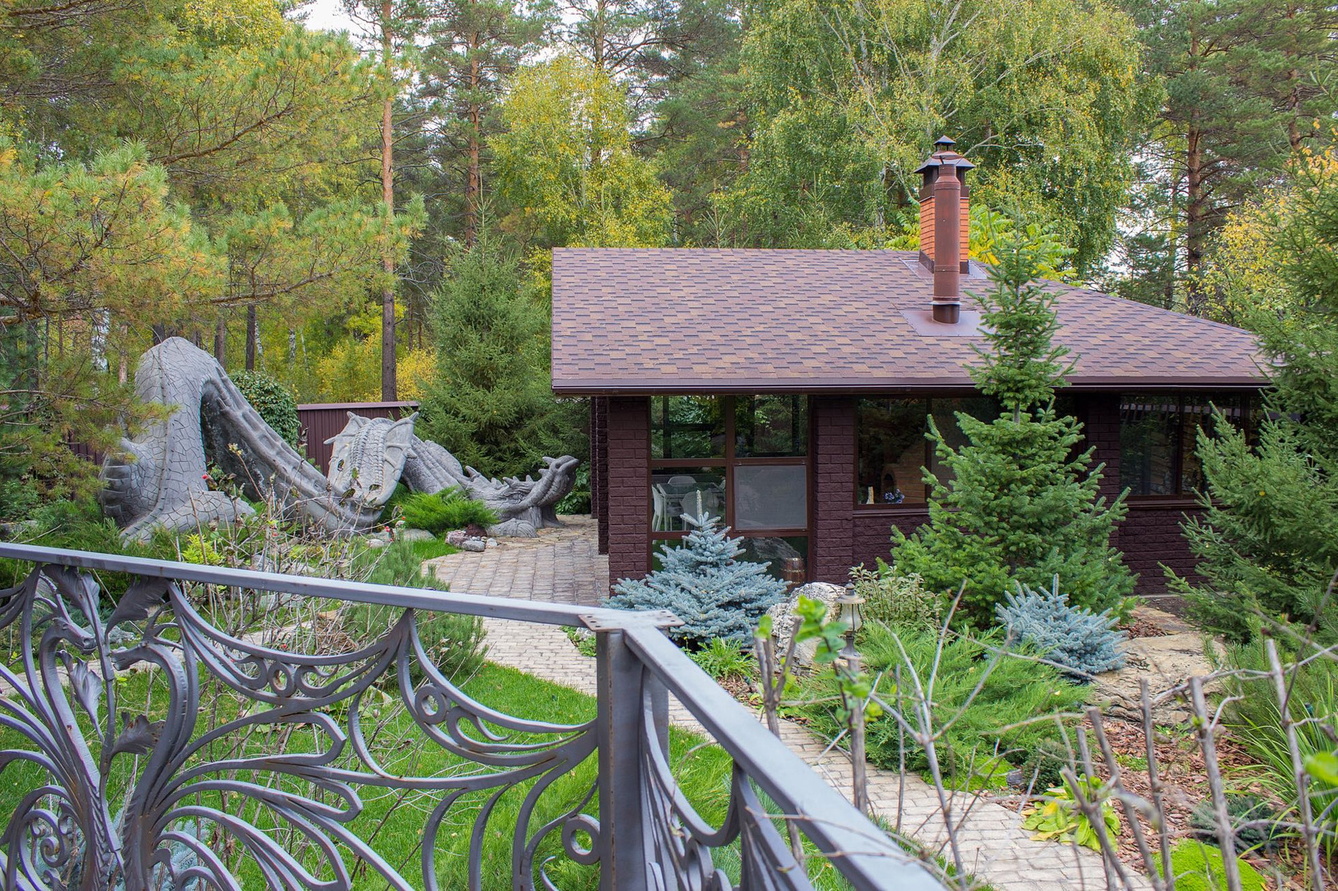 Вторая часть участка это свой СКВЕР - ПАРК, в котором ландшафтная архитектура наполняет собой разнообразным цветением многолетних кустарников и зеленью хвойных деревьев, среди которых уютно расположились гостевой дом с камином, гараж на несколько автомобилей с площадкой для парковки.