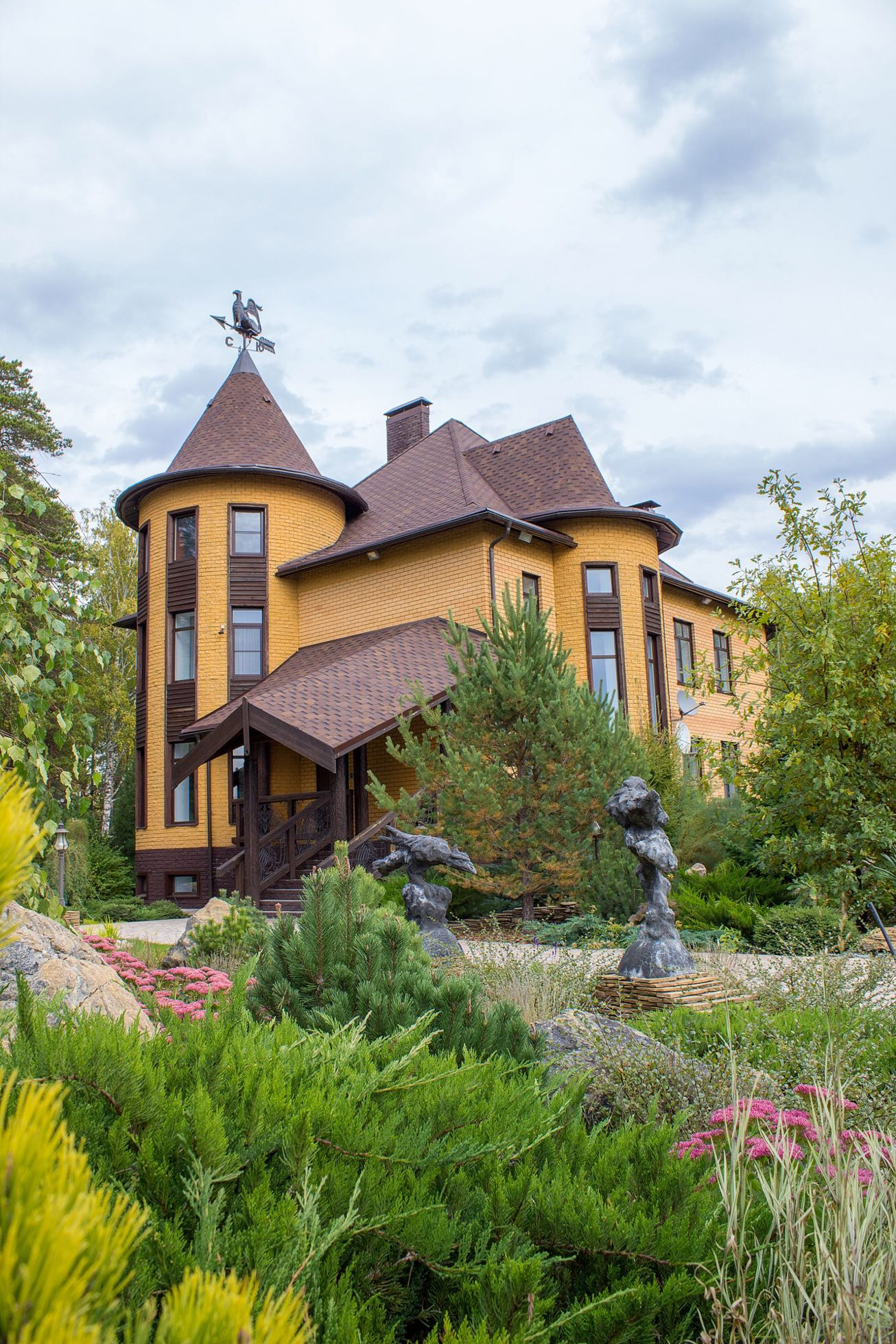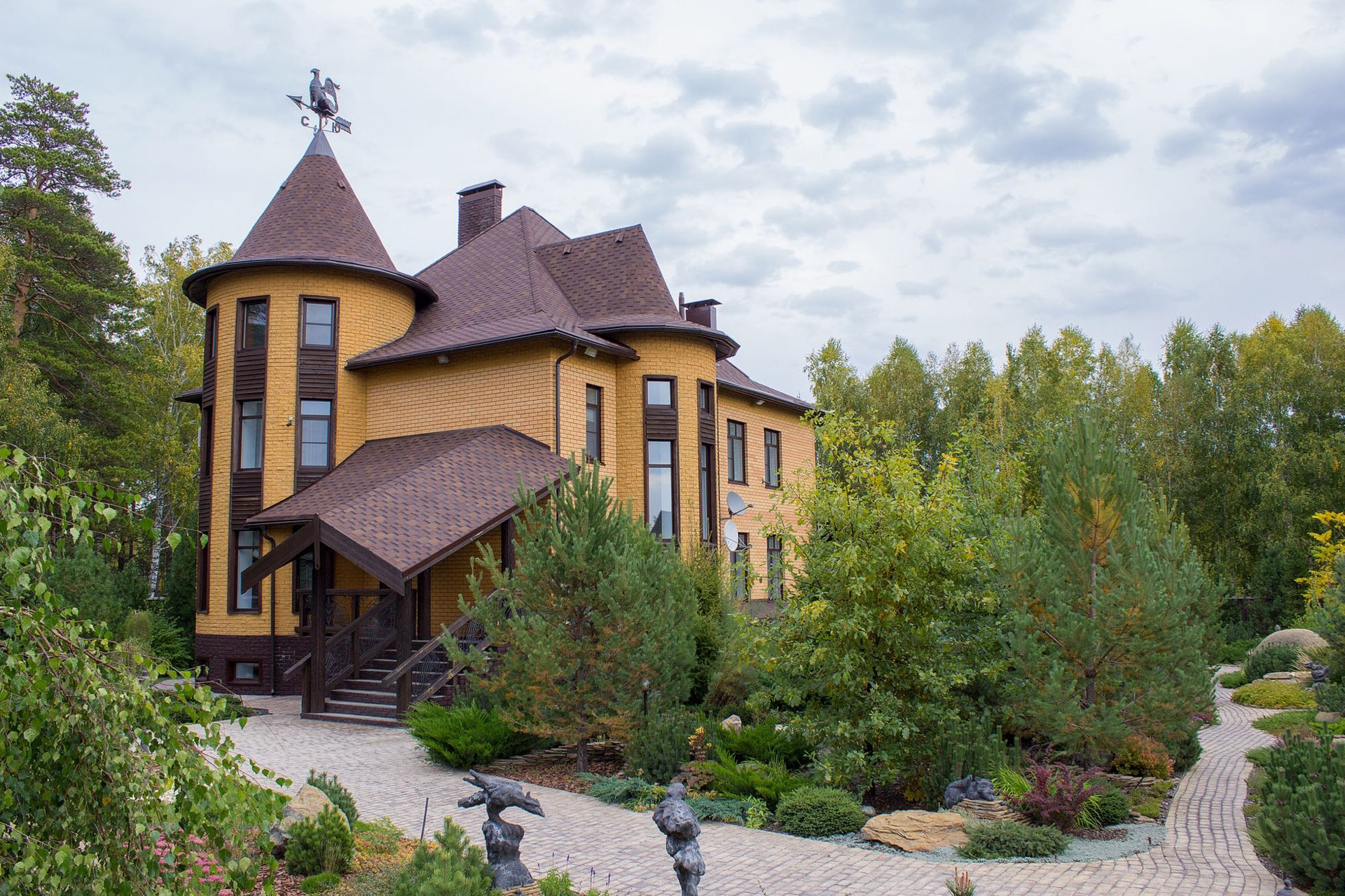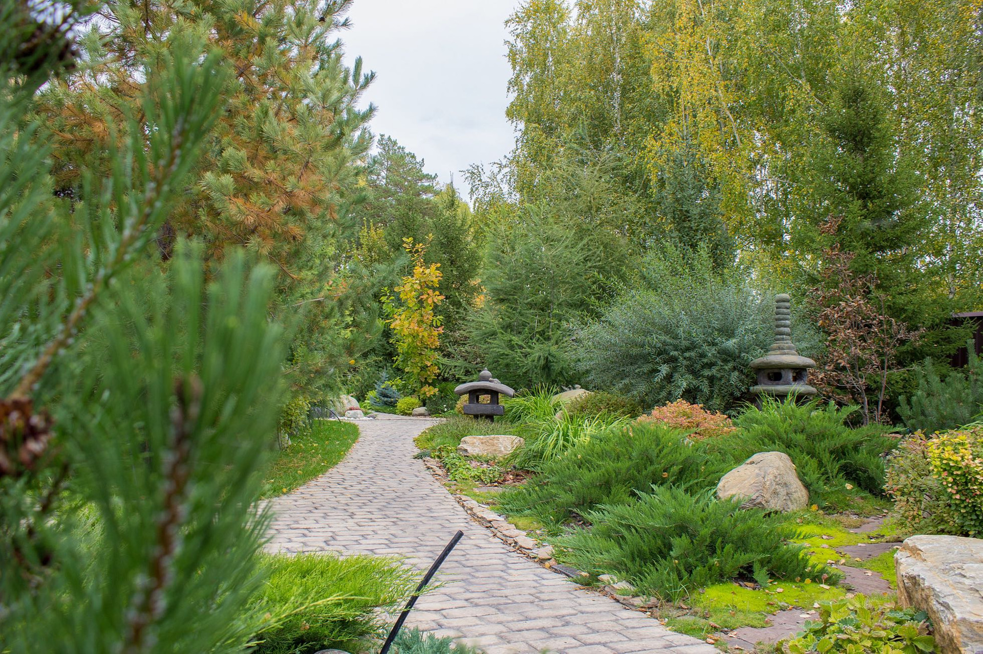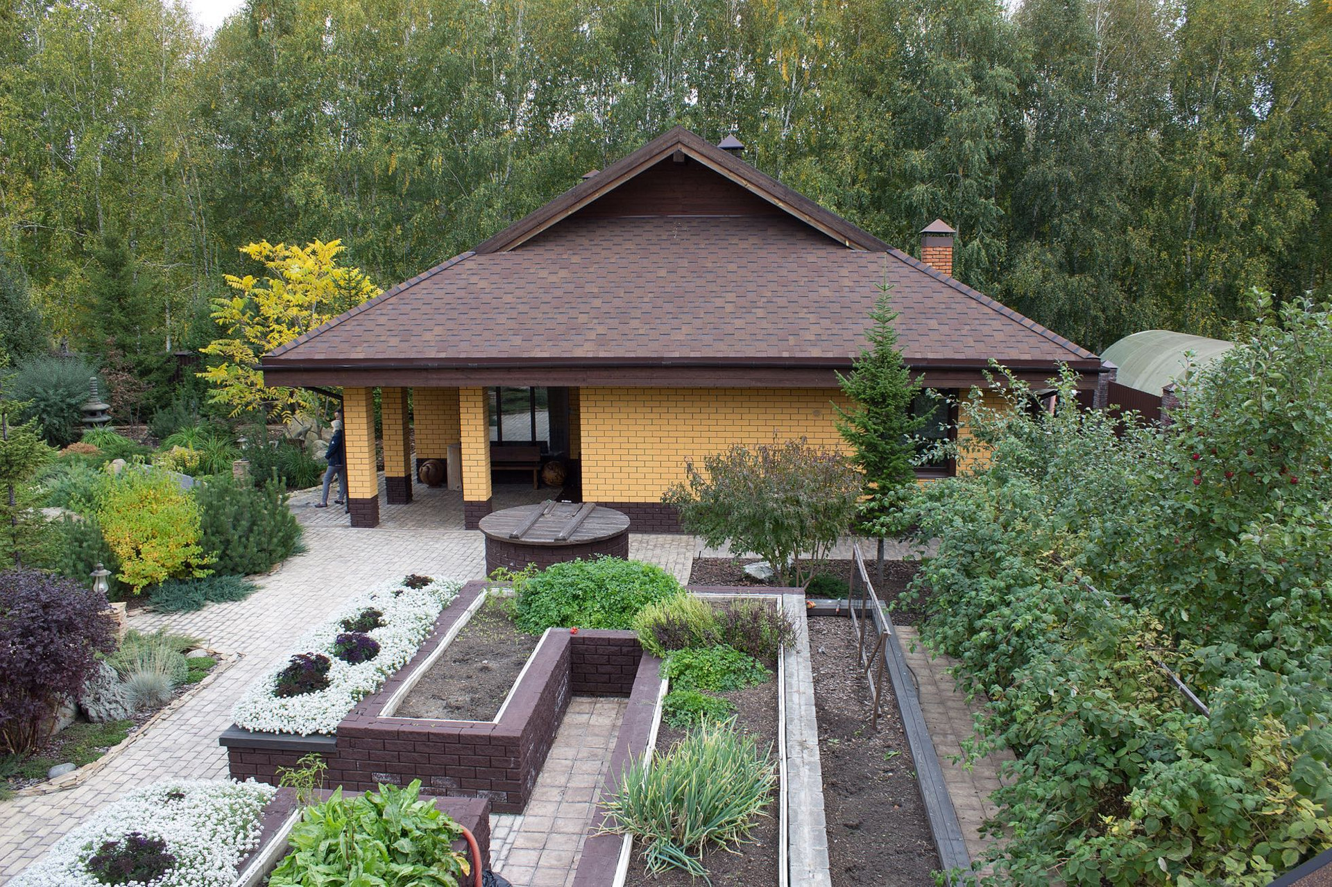 Вторая часть участка это свой СКВЕР - ПАРК, в котором ландшафтная архитектура наполняет собой разнообразным цветением многолетних кустарников и зеленью хвойных деревьев, среди которых уютно расположились гостевой дом с камином, гараж на несколько автомобилей с площадкой для парковки.