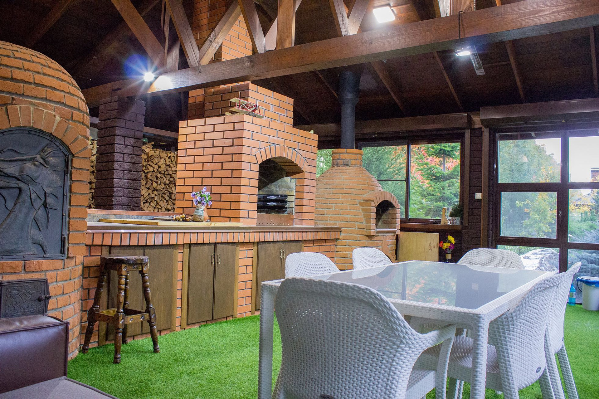 Третья зона - это зона для круглогодичного использования для приема гостей и личного пользования с печкой-коптильней, зоной барбекю, печью для пиццы и многое другое.