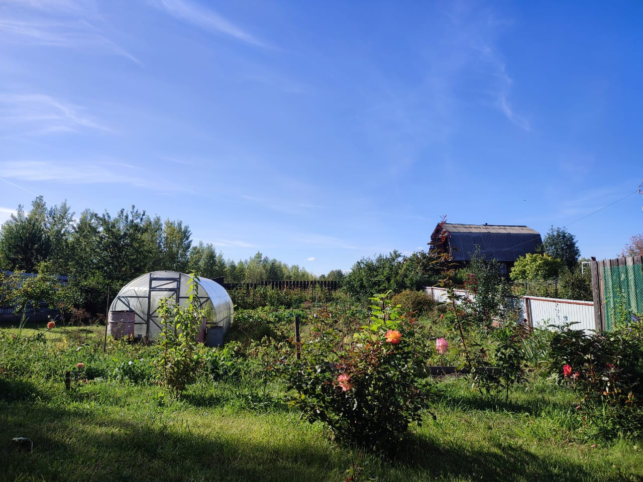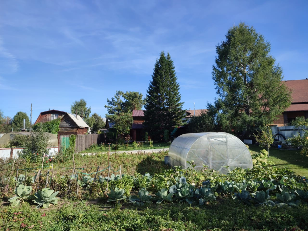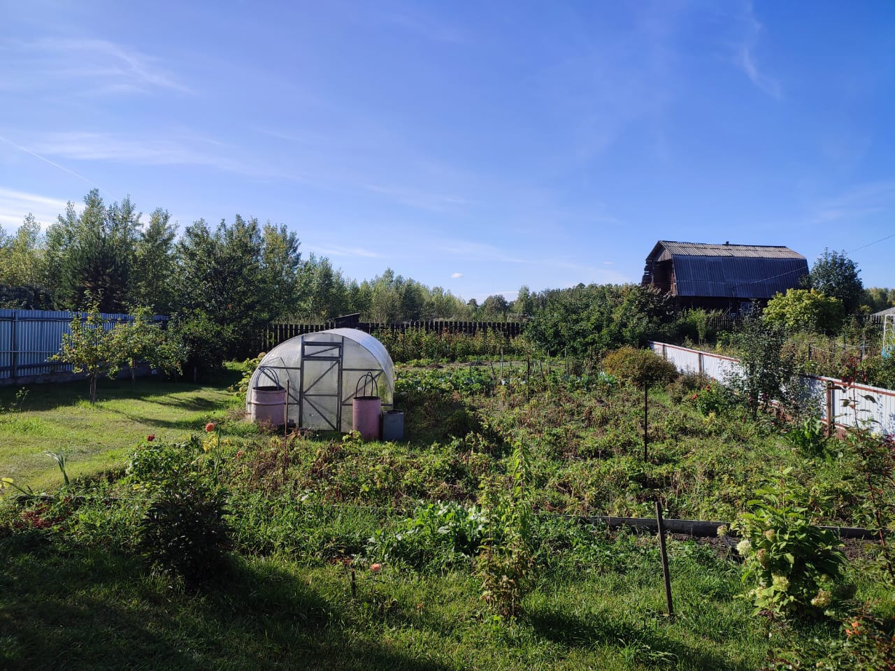 На участке растут пять взрослых хвойных деревьев и дуб-подросток. Есть теплица. Все посадки. Жимолость, вишня, смородина, яблони, малина, клубника, виноград и слива.